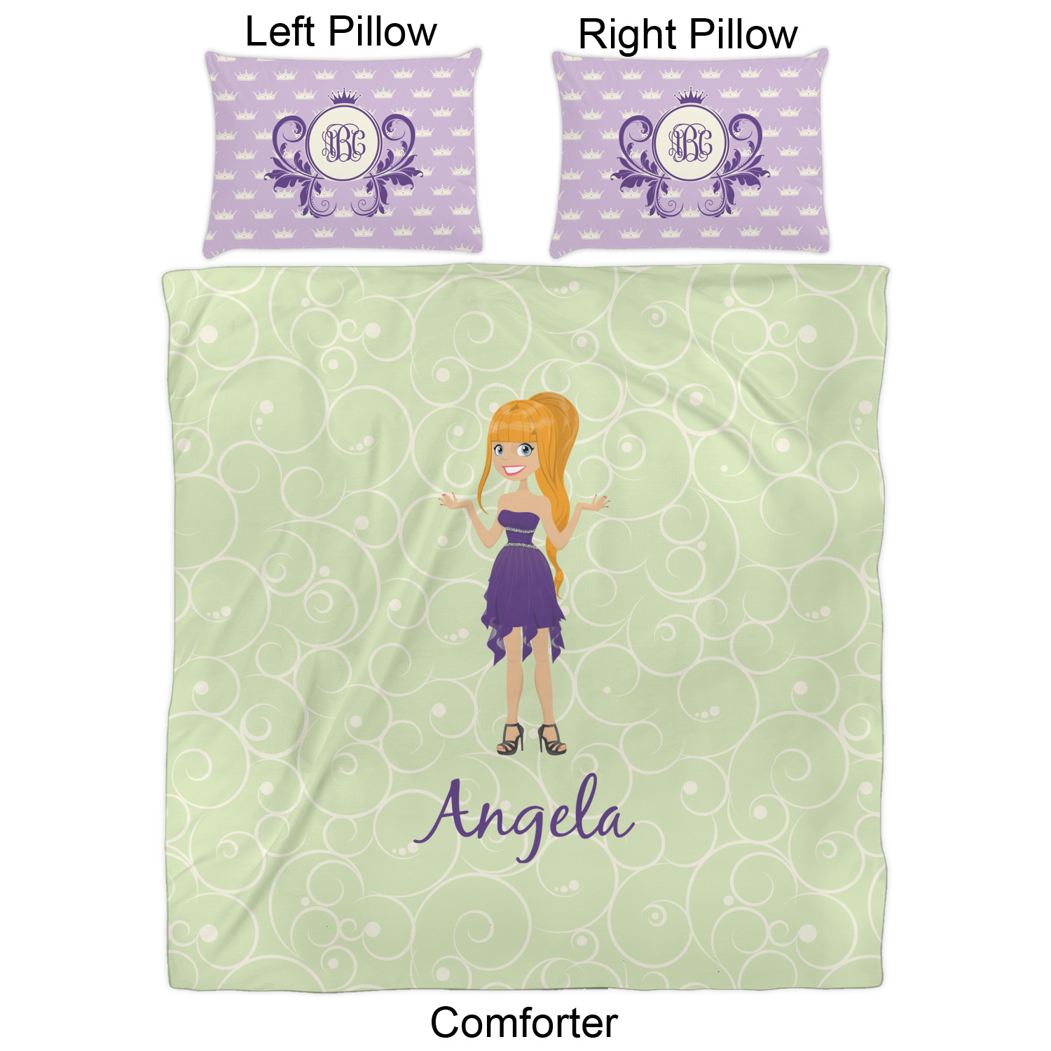 This design was built with a swirls background in a light green and cream color. We chose woman 1 wearing dress 3 and gave her blond hair, light skin, blue eyes, a purple dress and silver shoes. We personalized the design with her name.