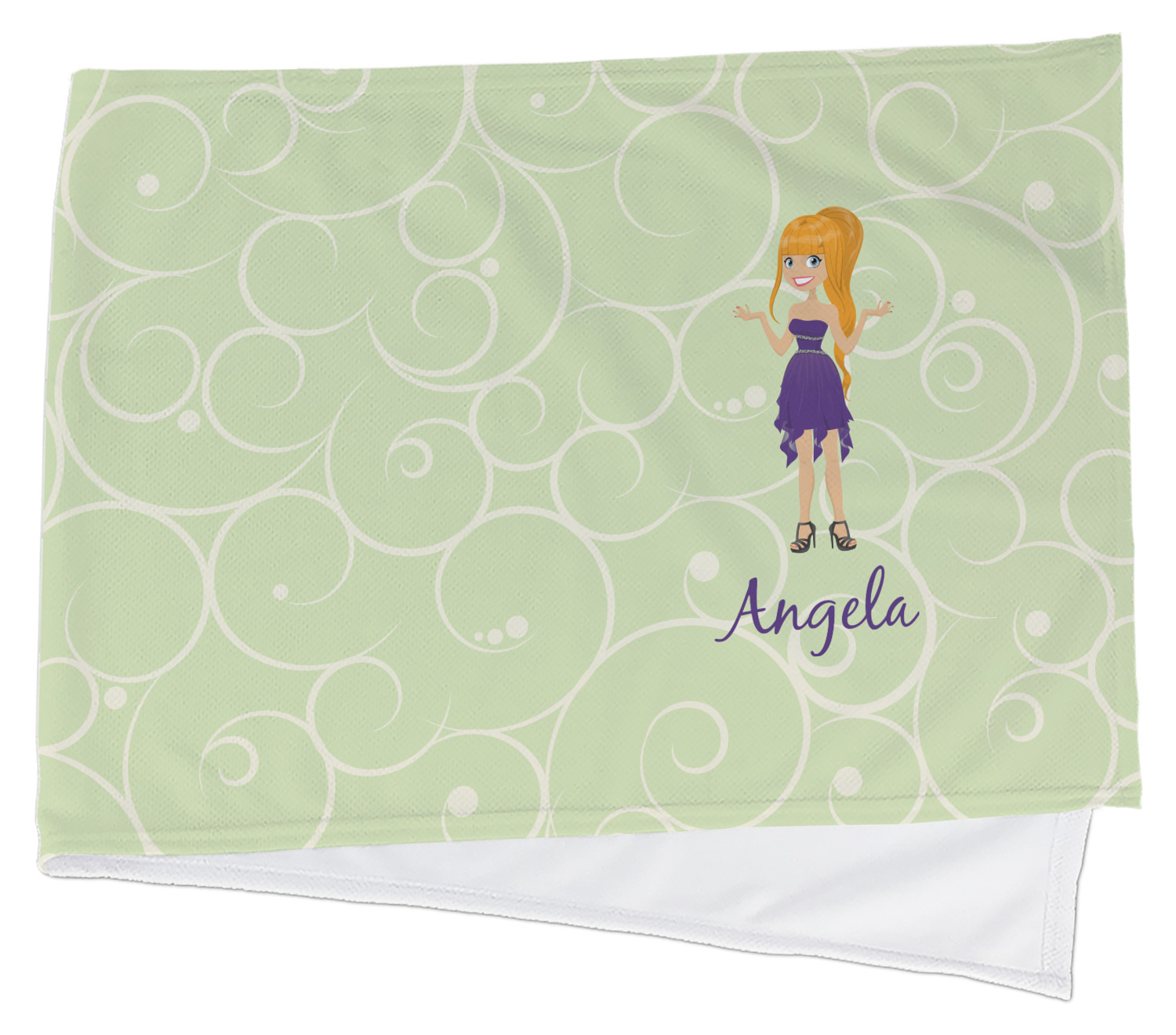 This design was built with a swirls background in a light green and cream color. We chose woman 1 wearing dress 3 and gave her blond hair, light skin, blue eyes, a purple dress and silver shoes. We personalized the design with her name.
