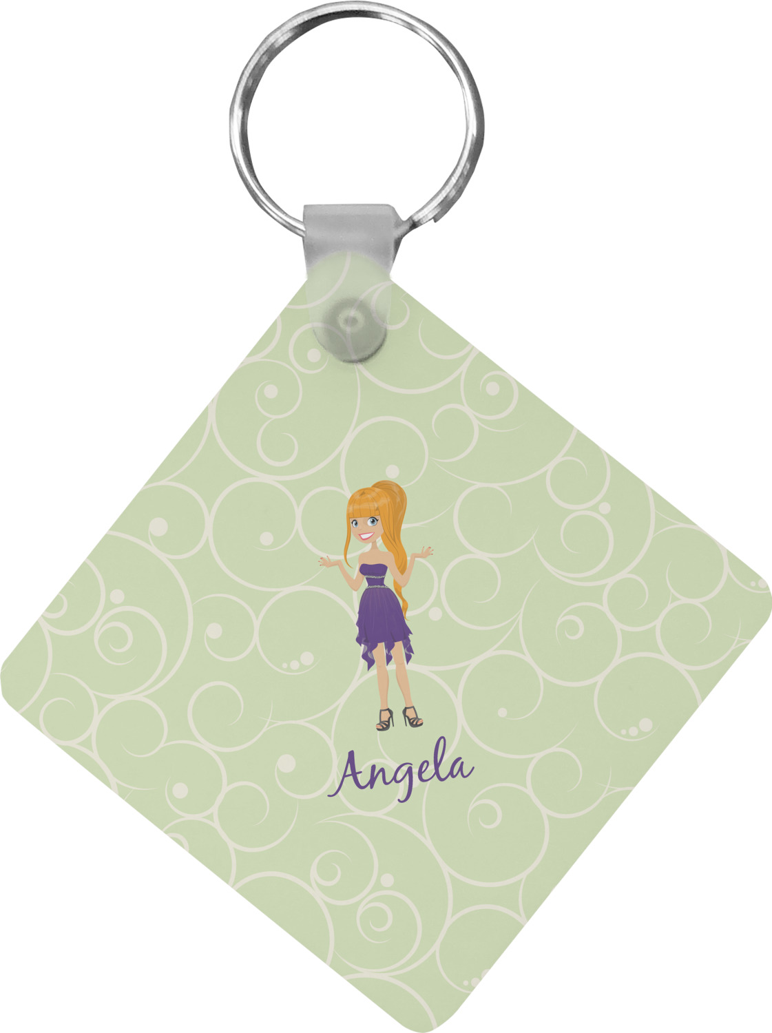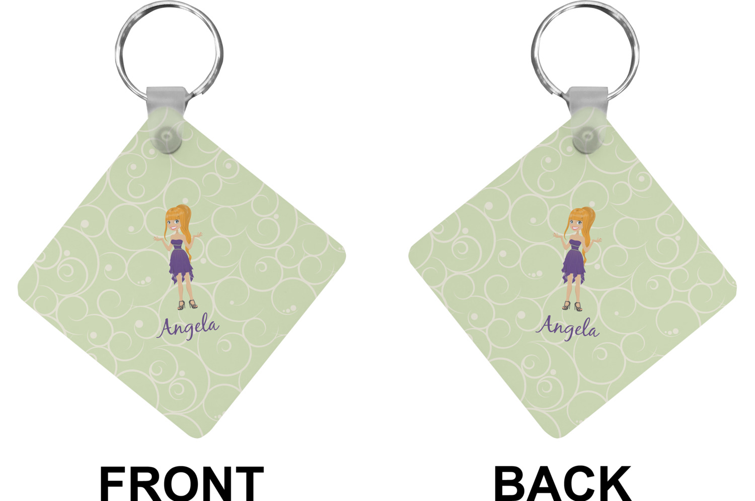 Our personalized keychains attach to the included metal, split key ring with a plastic, removable snap. Since a metal ring is included with your purchase, you have the liberty to keep your keys together on the ring, with or without your unique keychain. We offer this keychain in three different shapes: circle, heart, or diamond. We print your personalized design(s) on both sides of the key chain, and the surface has a glossy, reflective finish that only emphasizes your design. Each keychain is approximately 2.25 by 2.25 inches.