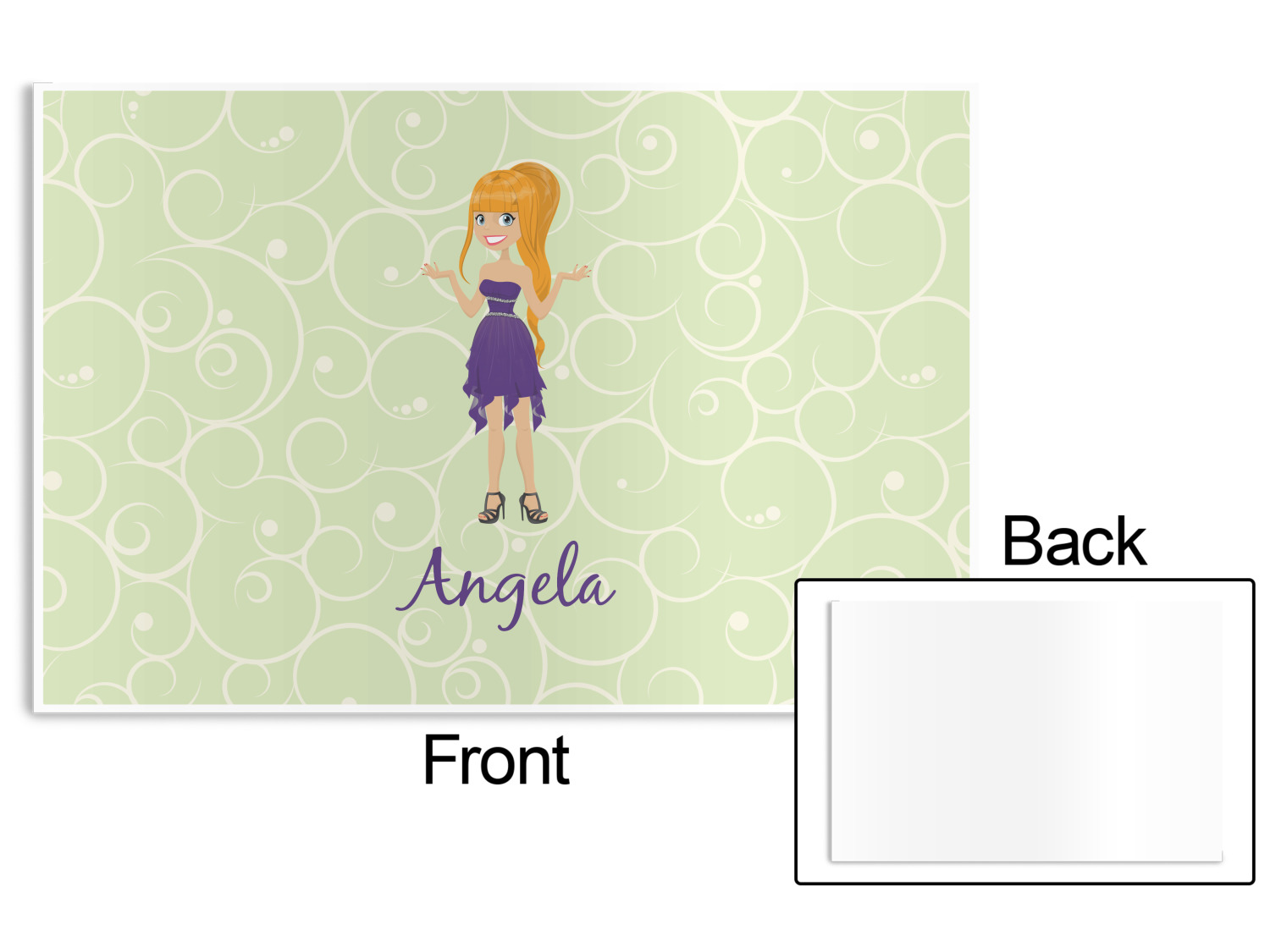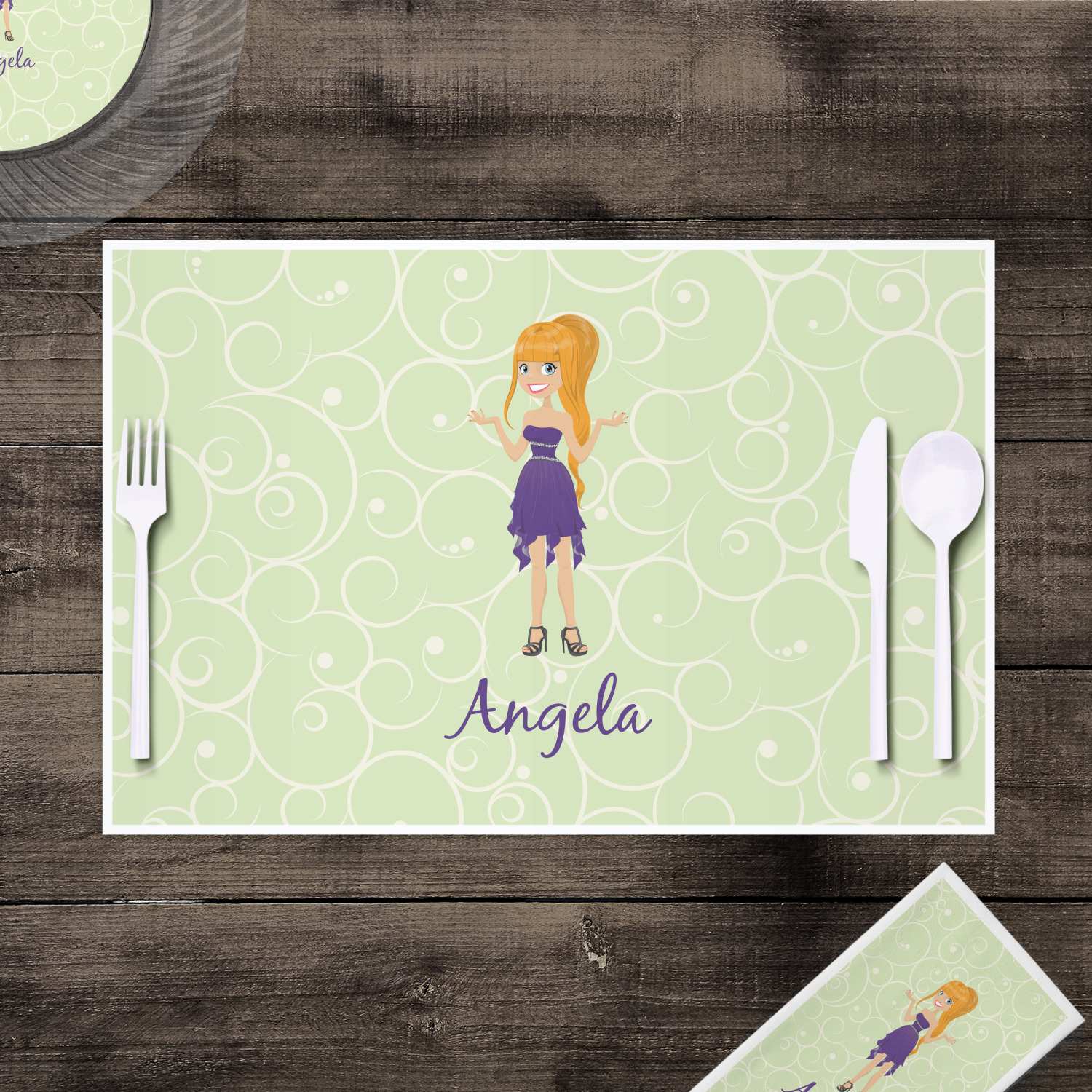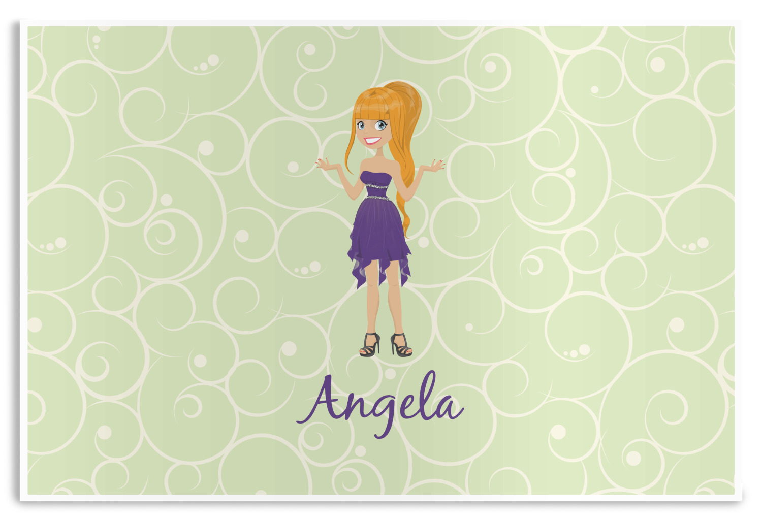 This design was built with a swirls background in a light green and cream color. We chose woman 1 wearing dress 3 and gave her blond hair, light skin, blue eyes, a purple dress and silver shoes. We personalized the design with her name.
