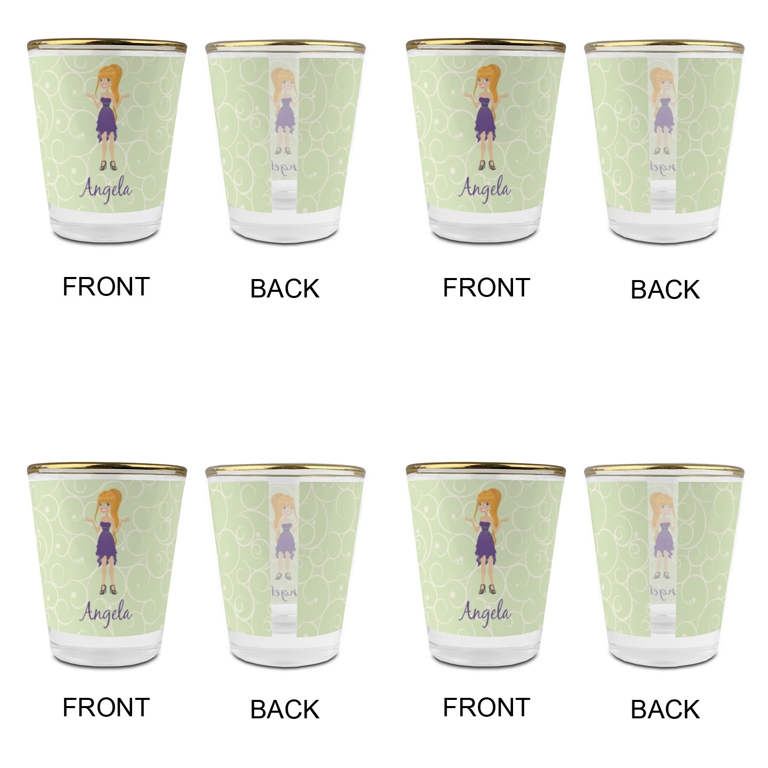 This design was built with a swirls background in a light green and cream color. We chose woman 1 wearing dress 3 and gave her blond hair, light skin, blue eyes, a purple dress and silver shoes. We personalized the design with her name.