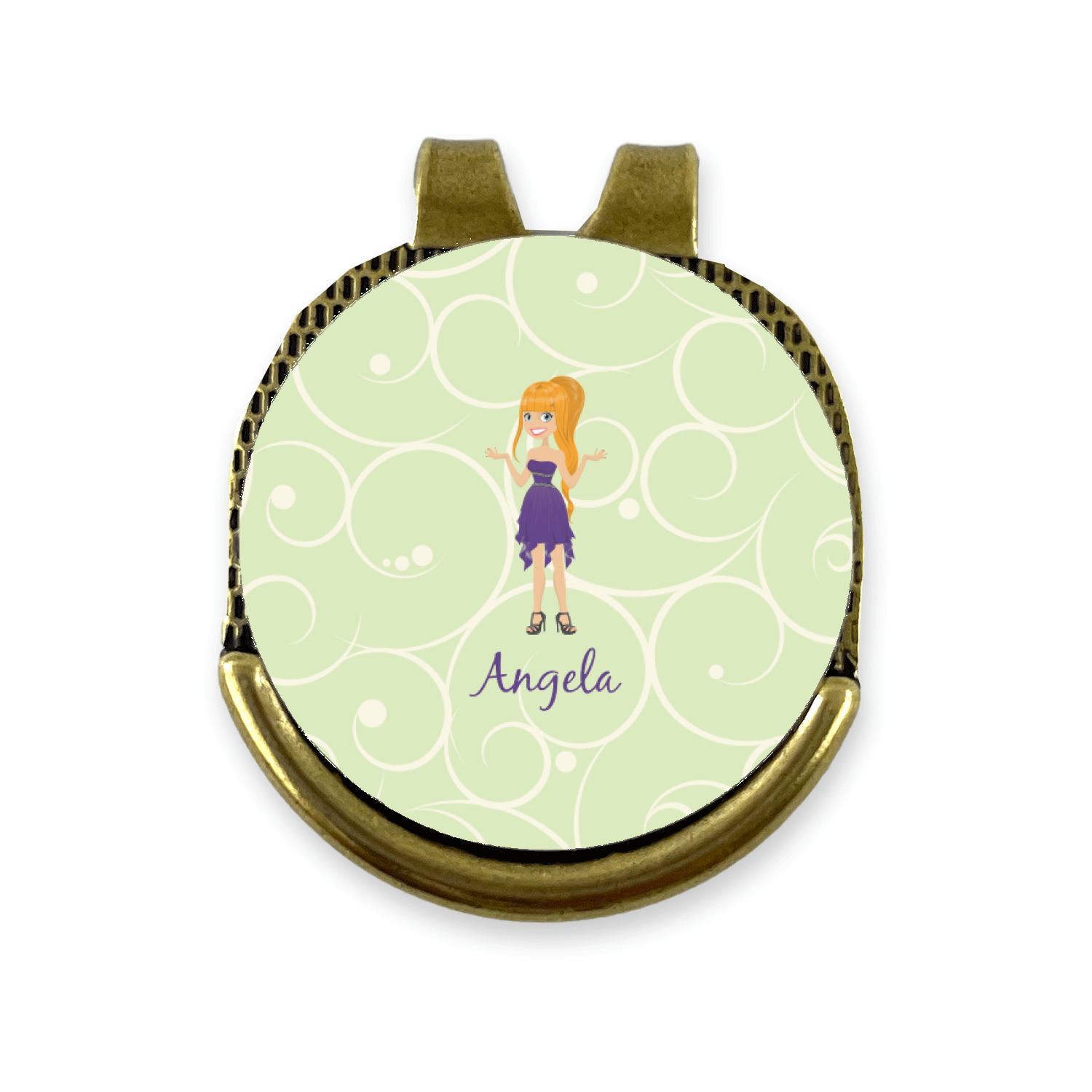 This design was built with a swirls background in a light green and cream color. We chose woman 1 wearing dress 3 and gave her blond hair, light skin, blue eyes, a purple dress and silver shoes. We personalized the design with her name.
