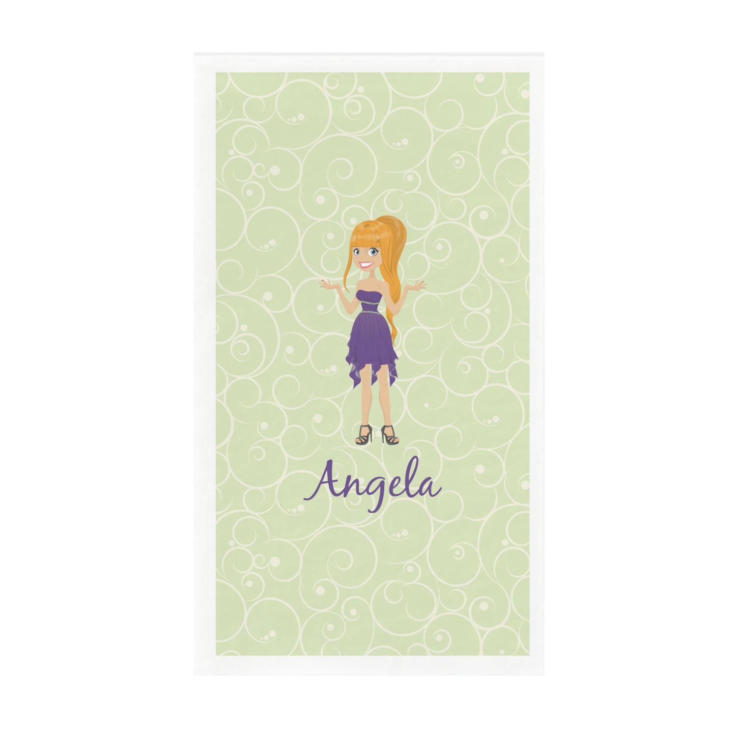 This design was built with a swirls background in a light green and cream color. We chose woman 1 wearing dress 3 and gave her blond hair, light skin, blue eyes, a purple dress and silver shoes. We personalized the design with her name.
