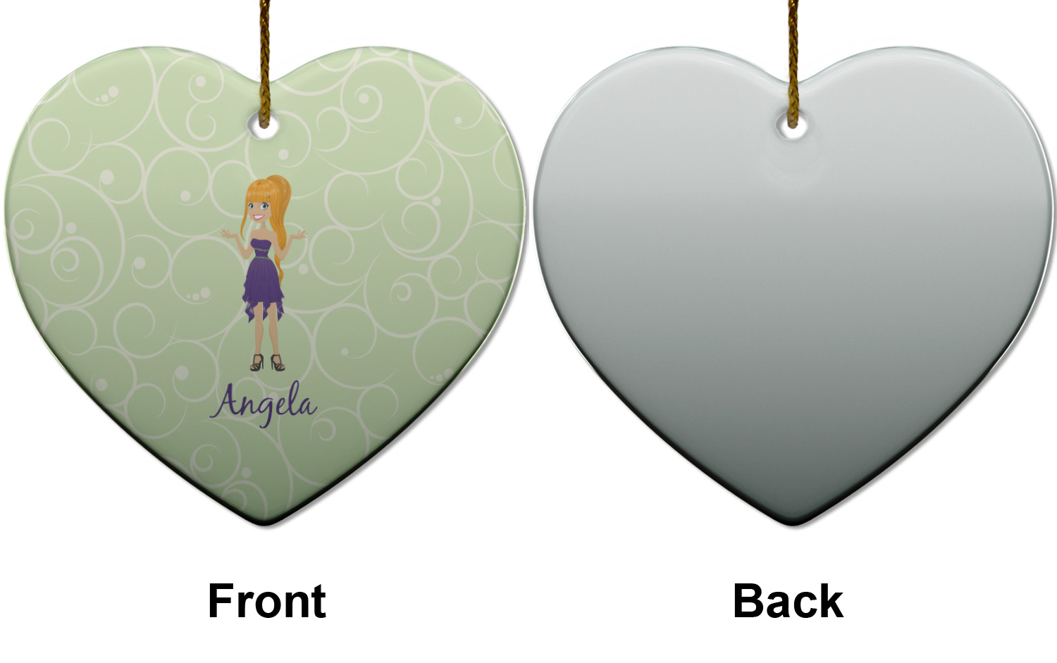 This design was built with a swirls background in a light green and cream color. We chose woman 1 wearing dress 3 and gave her blond hair, light skin, blue eyes, a purple dress and silver shoes. We personalized the design with her name.