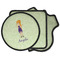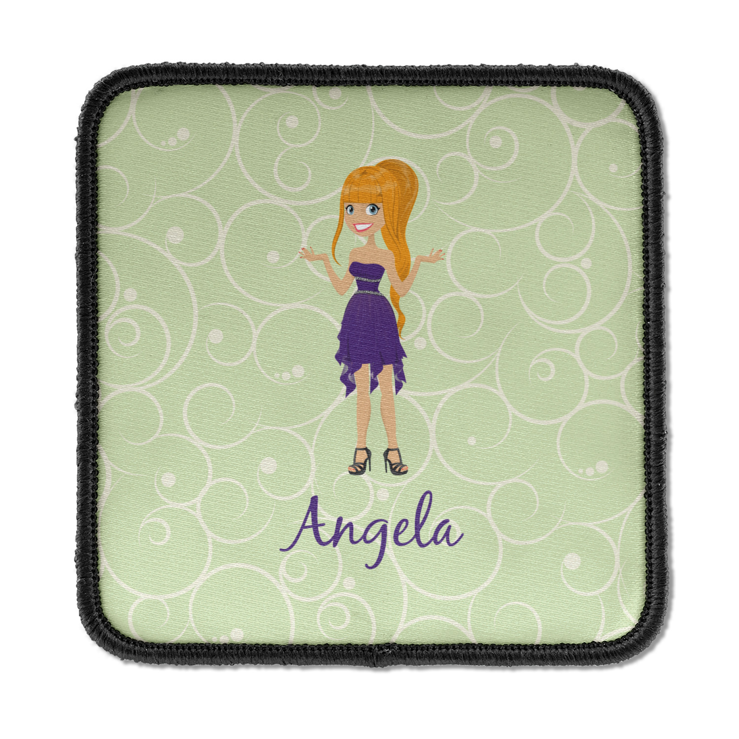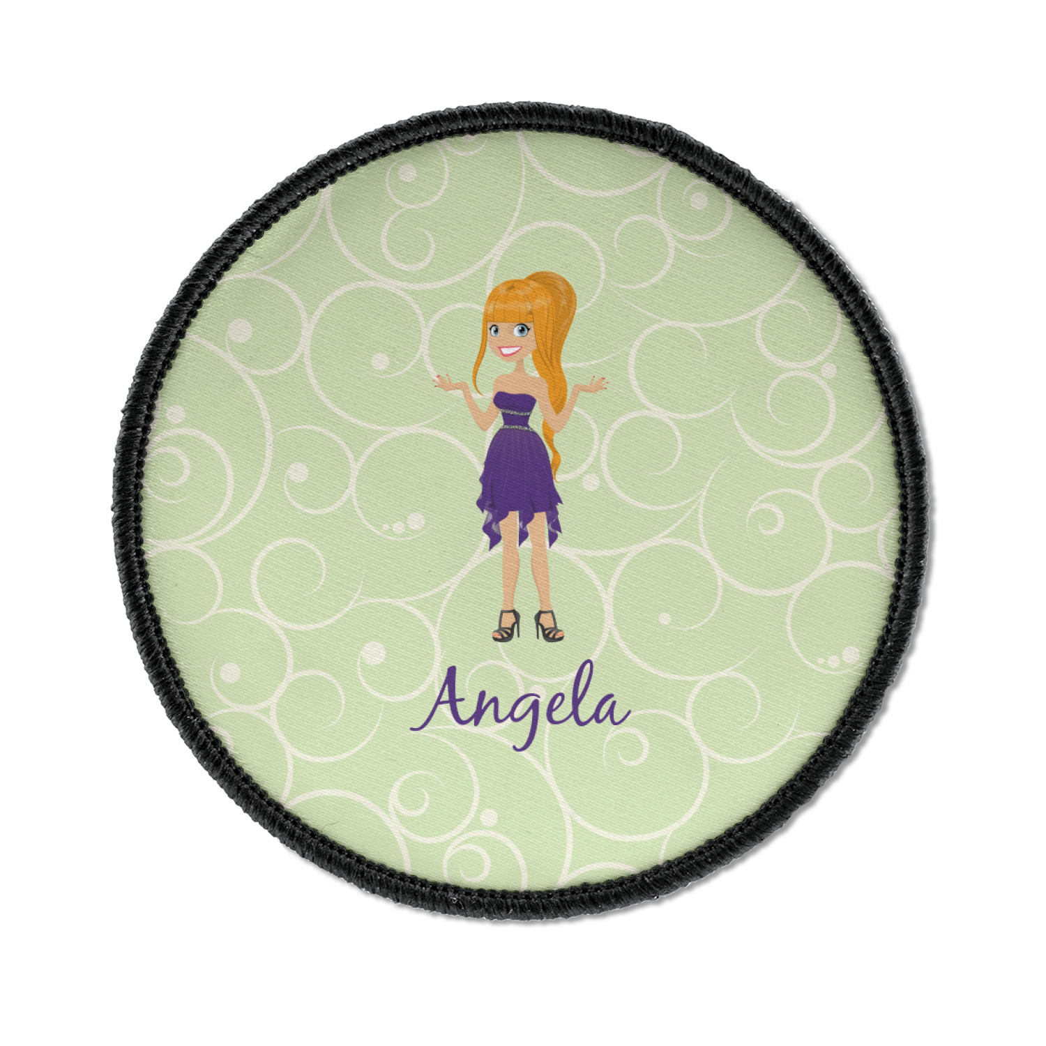 This design was built with a swirls background in a light green and cream color. We chose woman 1 wearing dress 3 and gave her blond hair, light skin, blue eyes, a purple dress and silver shoes. We personalized the design with her name.