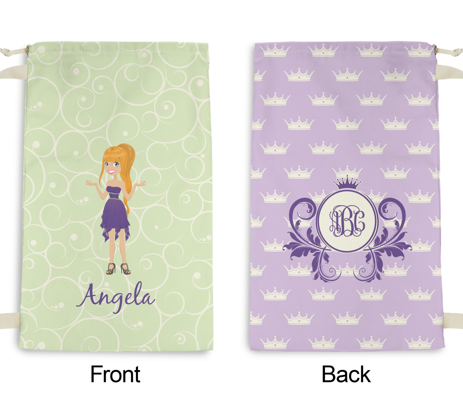 Carry your laundry in style with these customized laundry bags. Available in two sizes, featuring a natural colored woven strap and a cinch cord, these bags hold a lot of clothes or anything else you want to fit in them.