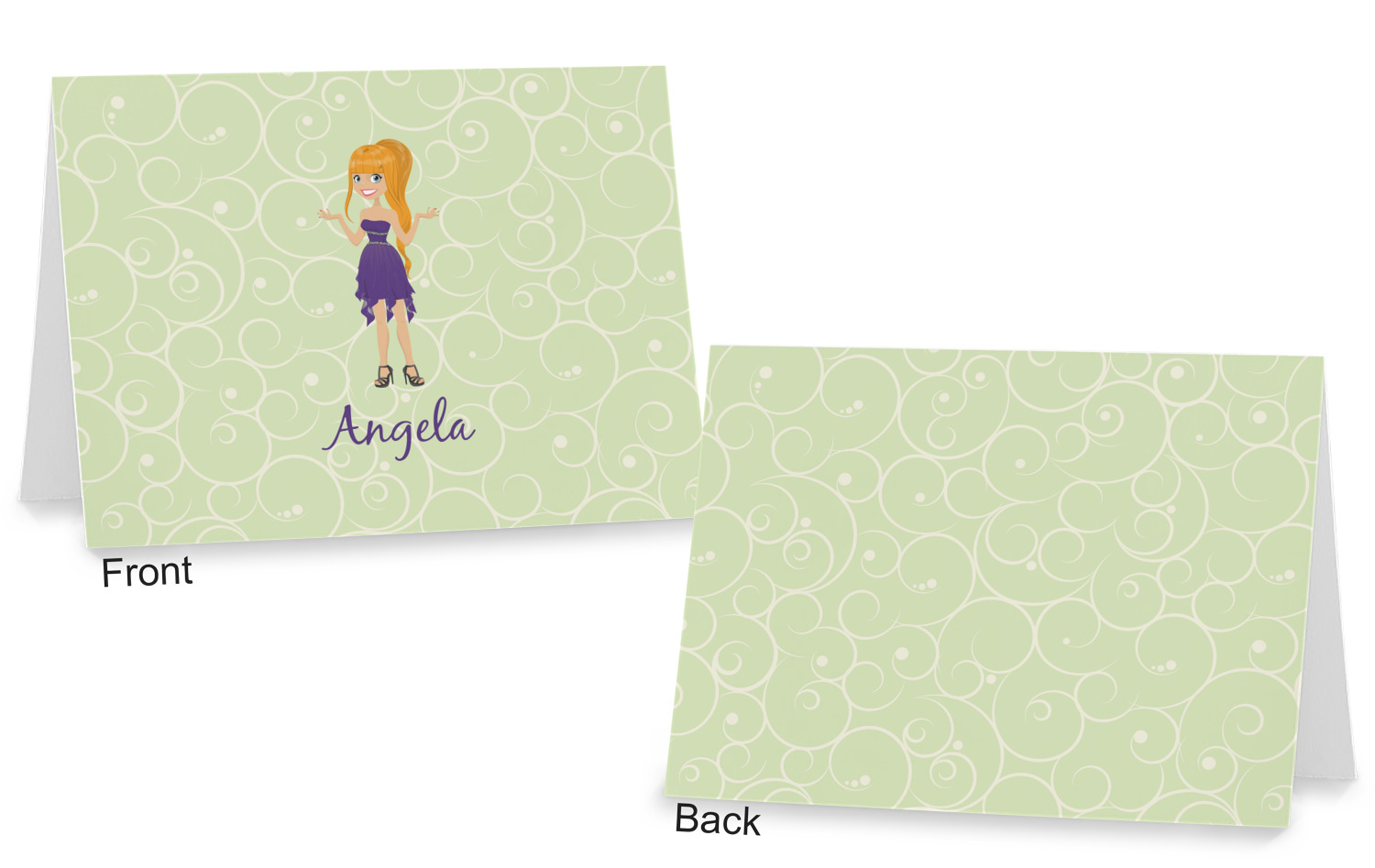 This design was built with a swirls background in a light green and cream color. We chose woman 1 wearing dress 3 and gave her blond hair, light skin, blue eyes, a purple dress and silver shoes. We personalized the design with her name.