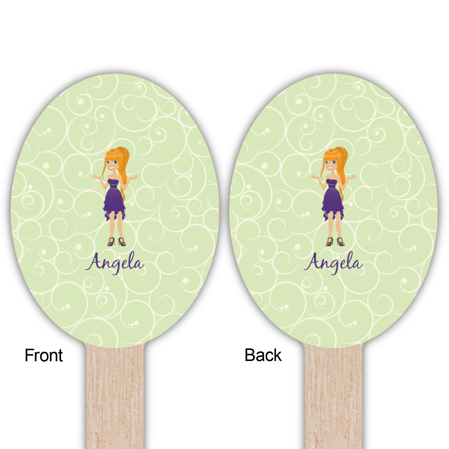 This design was built with a swirls background in a light green and cream color. We chose woman 1 wearing dress 3 and gave her blond hair, light skin, blue eyes, a purple dress and silver shoes. We personalized the design with her name.