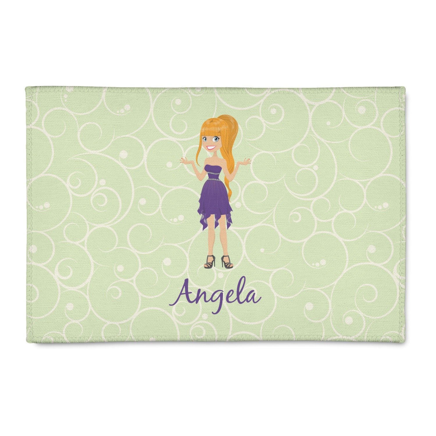 This design was built with a swirls background in a light green and cream color. We chose woman 1 wearing dress 3 and gave her blond hair, light skin, blue eyes, a purple dress and silver shoes. We personalized the design with her name.