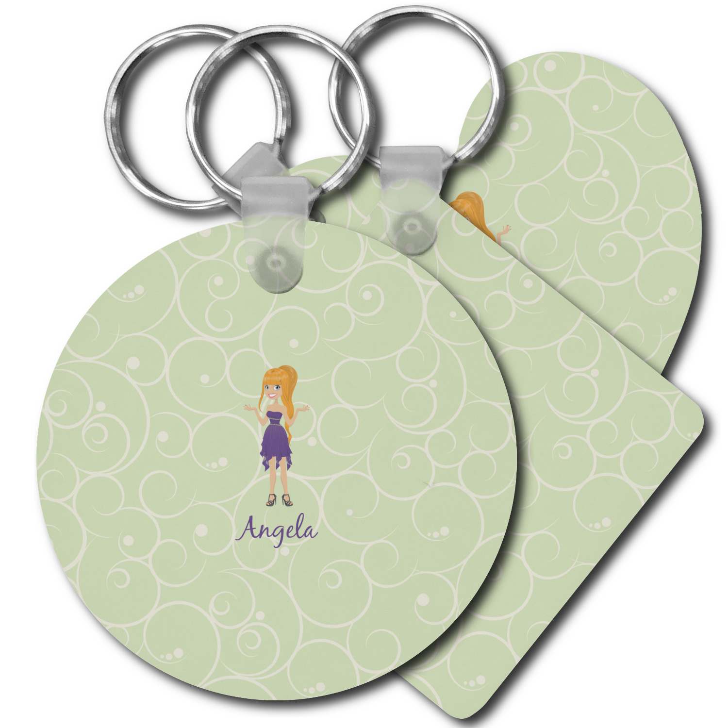 Our personalized keychains attach to the included metal, split key ring with a plastic, removable snap. Since a metal ring is included with your purchase, you have the liberty to keep your keys together on the ring, with or without your unique keychain. We offer this keychain in three different shapes: circle, heart, or diamond. We print your personalized design(s) on both sides of the key chain, and the surface has a glossy, reflective finish that only emphasizes your design. Each keychain is approximately 2.25 by 2.25 inches.