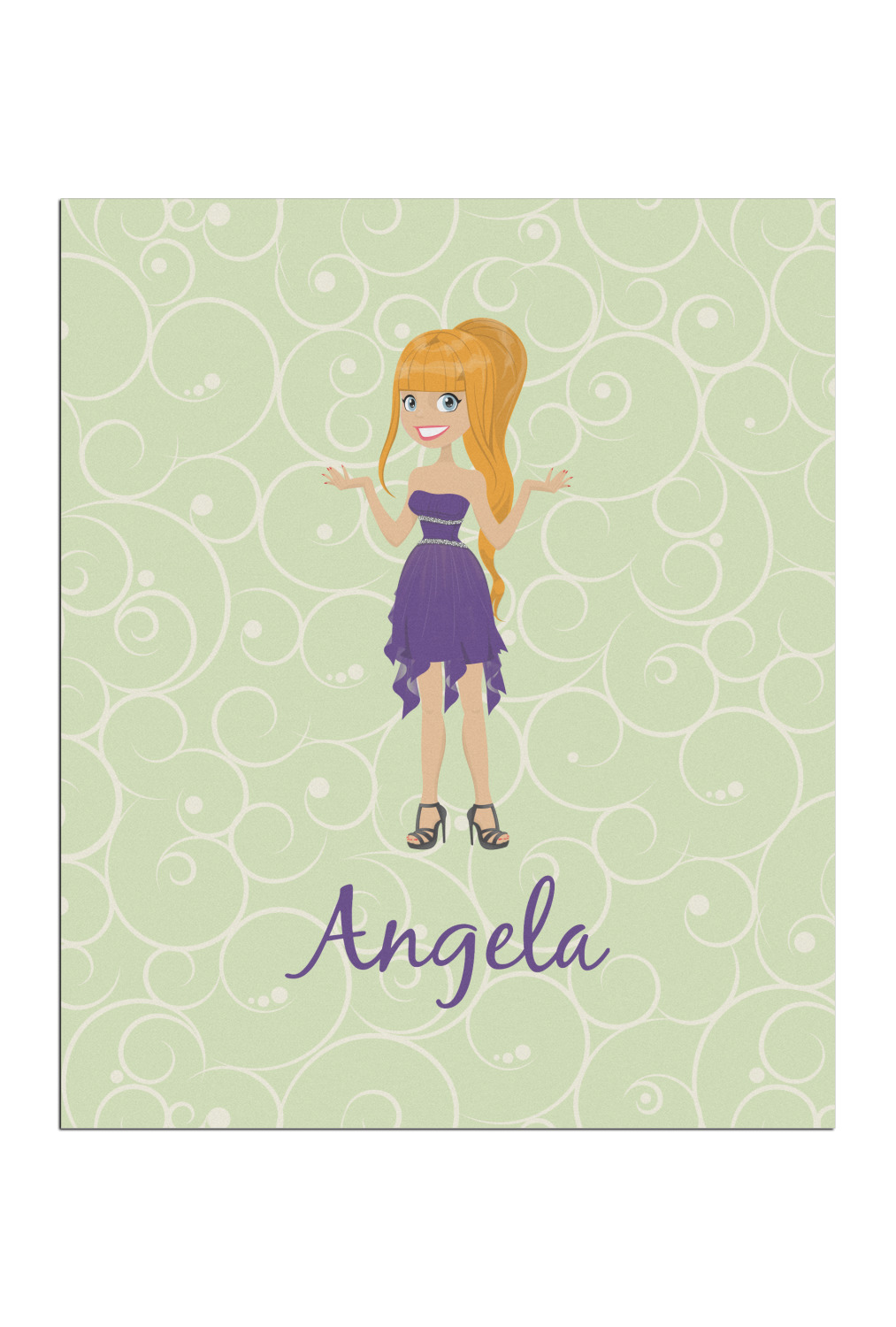 This design was built with a swirls background in a light green and cream color. We chose woman 1 wearing dress 3 and gave her blond hair, light skin, blue eyes, a purple dress and silver shoes. We personalized the design with her name.