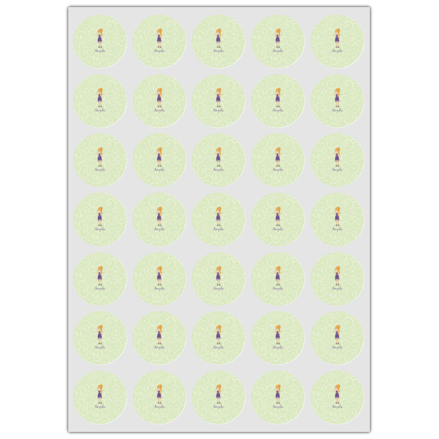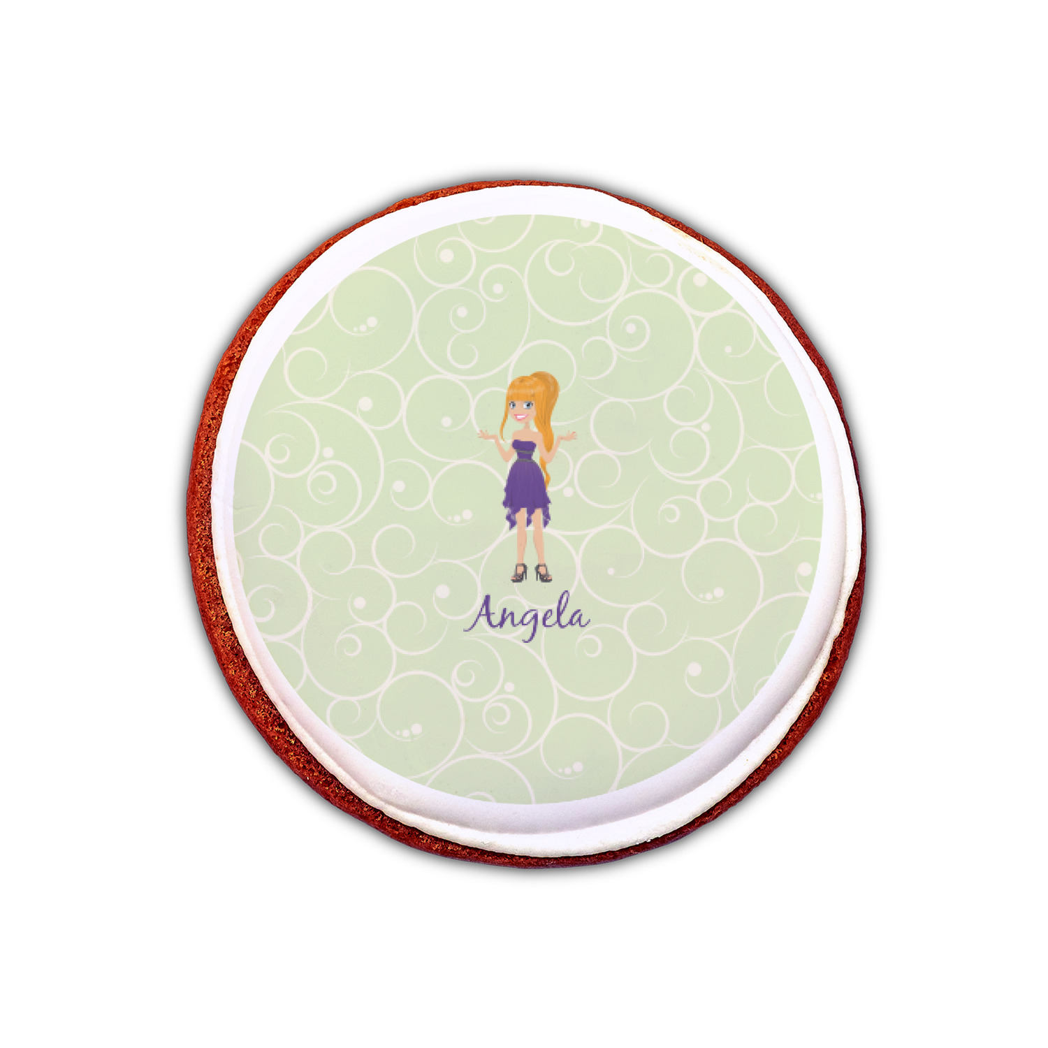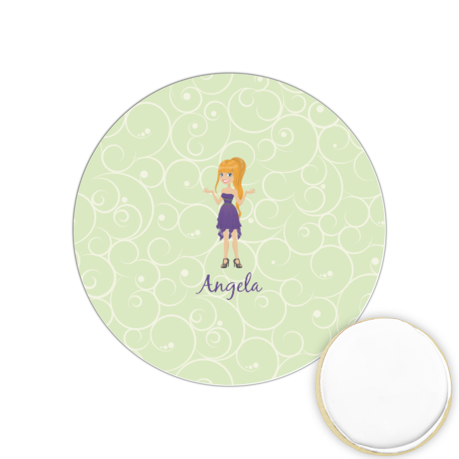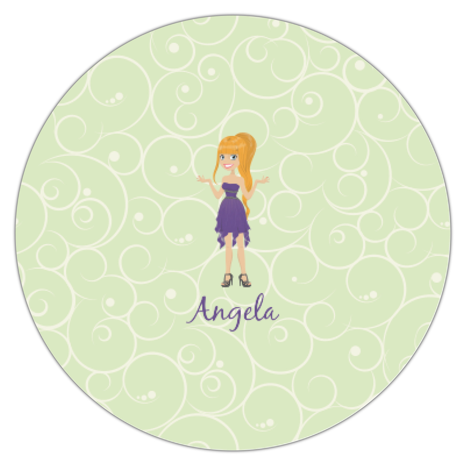 This design was built with a swirls background in a light green and cream color. We chose woman 1 wearing dress 3 and gave her blond hair, light skin, blue eyes, a purple dress and silver shoes. We personalized the design with her name.