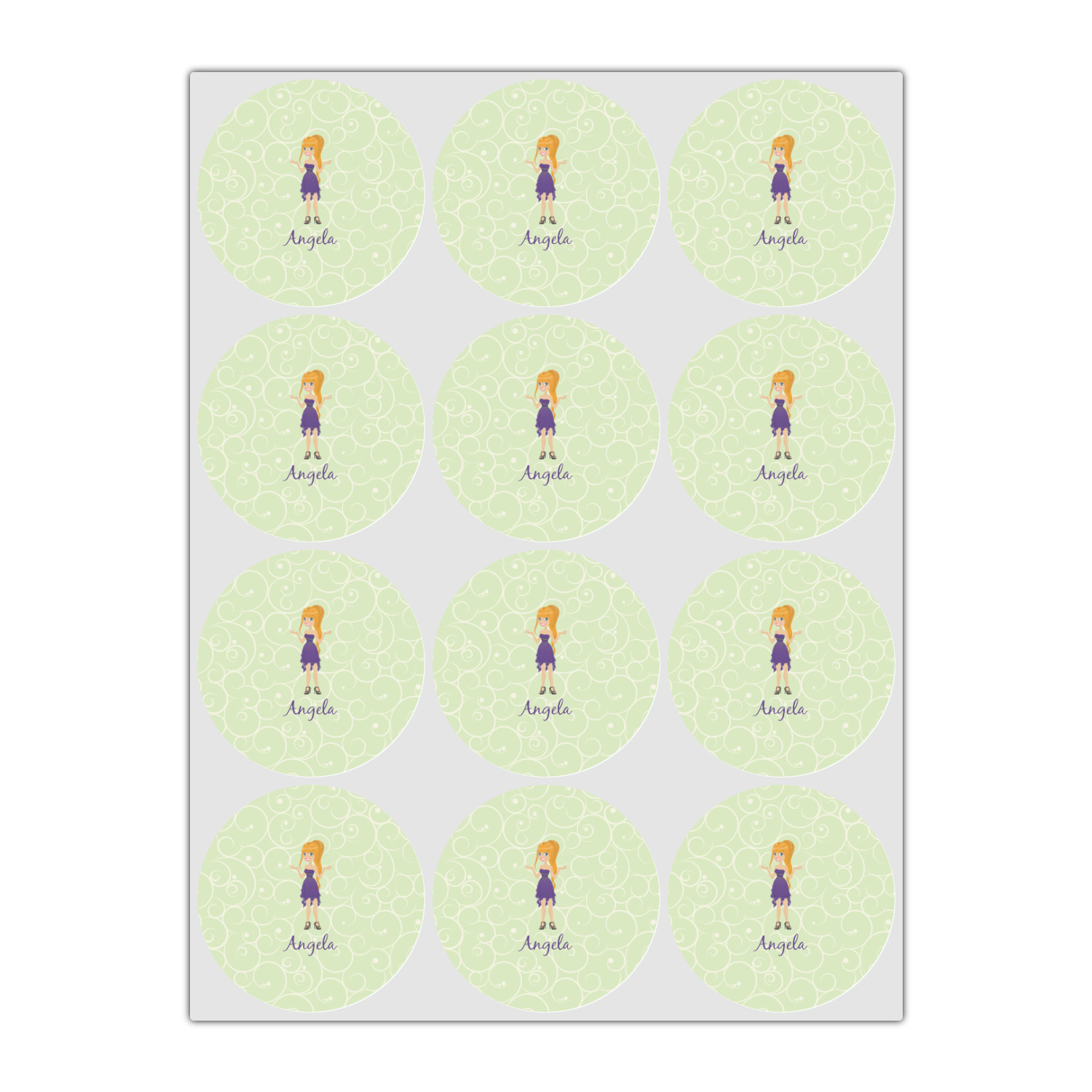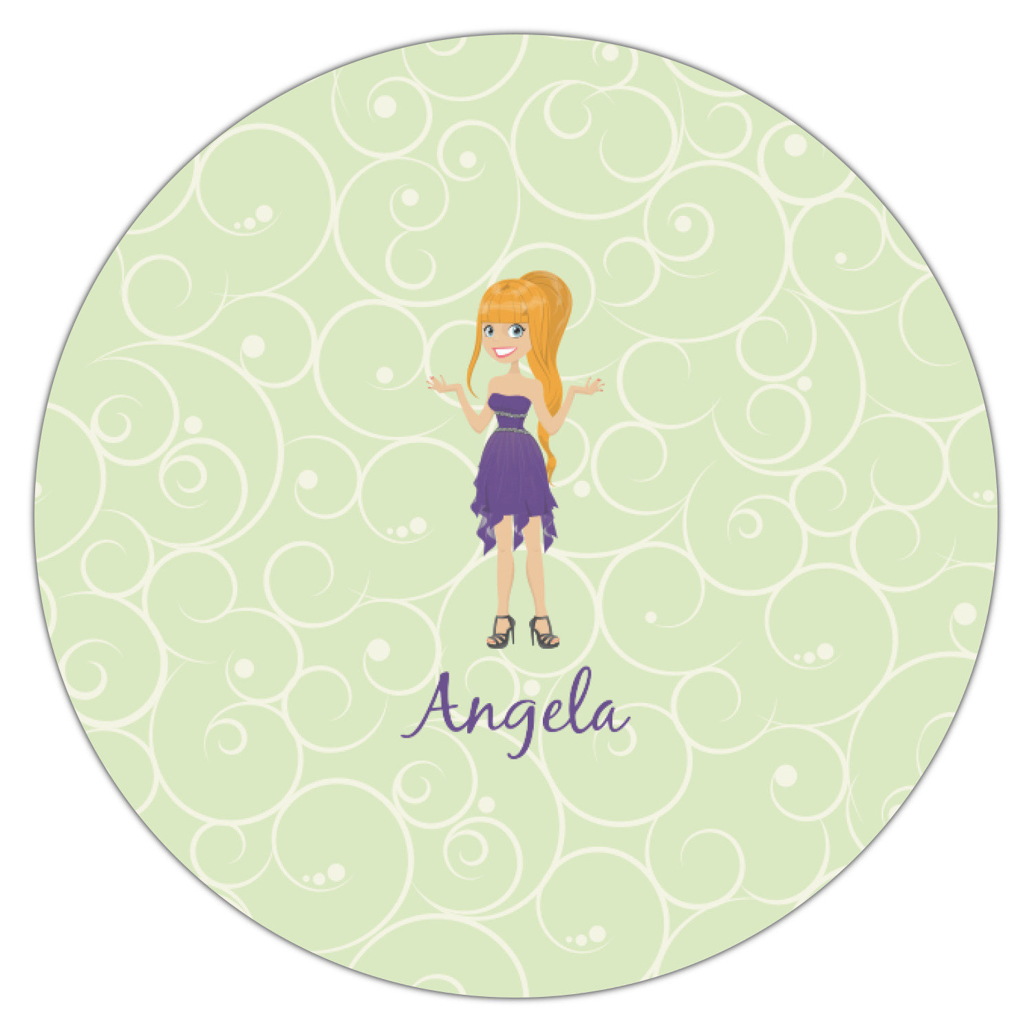 This design was built with a swirls background in a light green and cream color. We chose woman 1 wearing dress 3 and gave her blond hair, light skin, blue eyes, a purple dress and silver shoes. We personalized the design with her name.