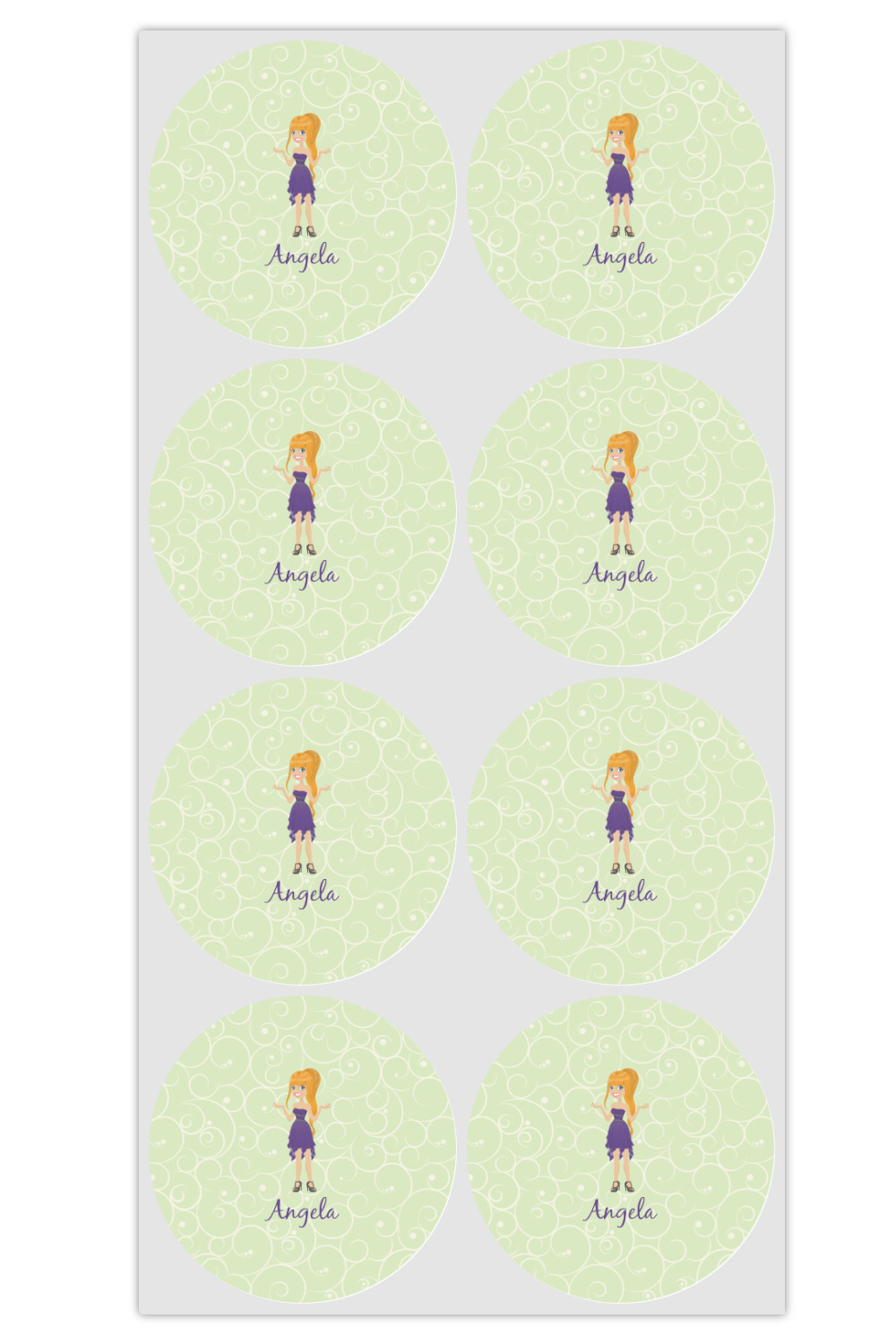 This design was built with a swirls background in a light green and cream color. We chose woman 1 wearing dress 3 and gave her blond hair, light skin, blue eyes, a purple dress and silver shoes. We personalized the design with her name.