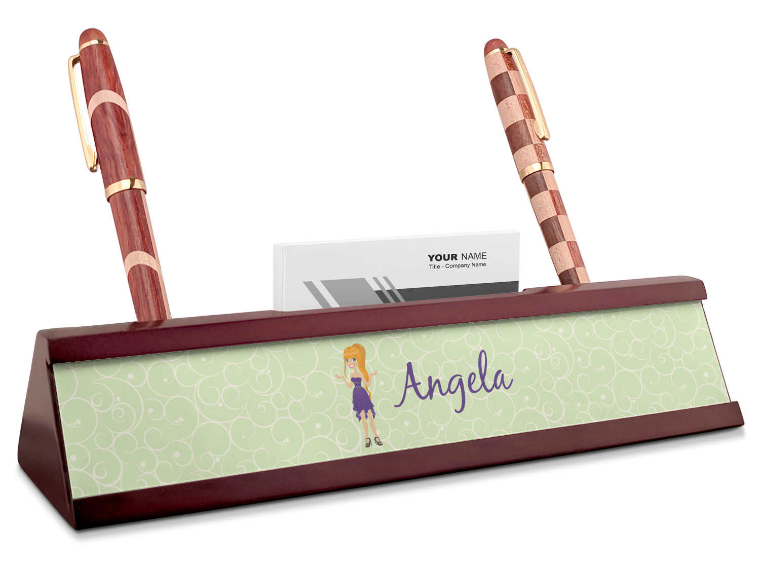 Your desk name plates are crafted from a high-quality, dark-cherry mahogany. At approximately 9.5 by 1.875 by 2.5 inches, this name plaque will fit perfectly, front and center, on your desk. Your customization spans across the entire face of the nameplate. Behind the nameplate lies a skinny slot that can fit approximately 15, traditionally-sized, business cards. You can also store your writing utensils on either side of this custom desk name plate.