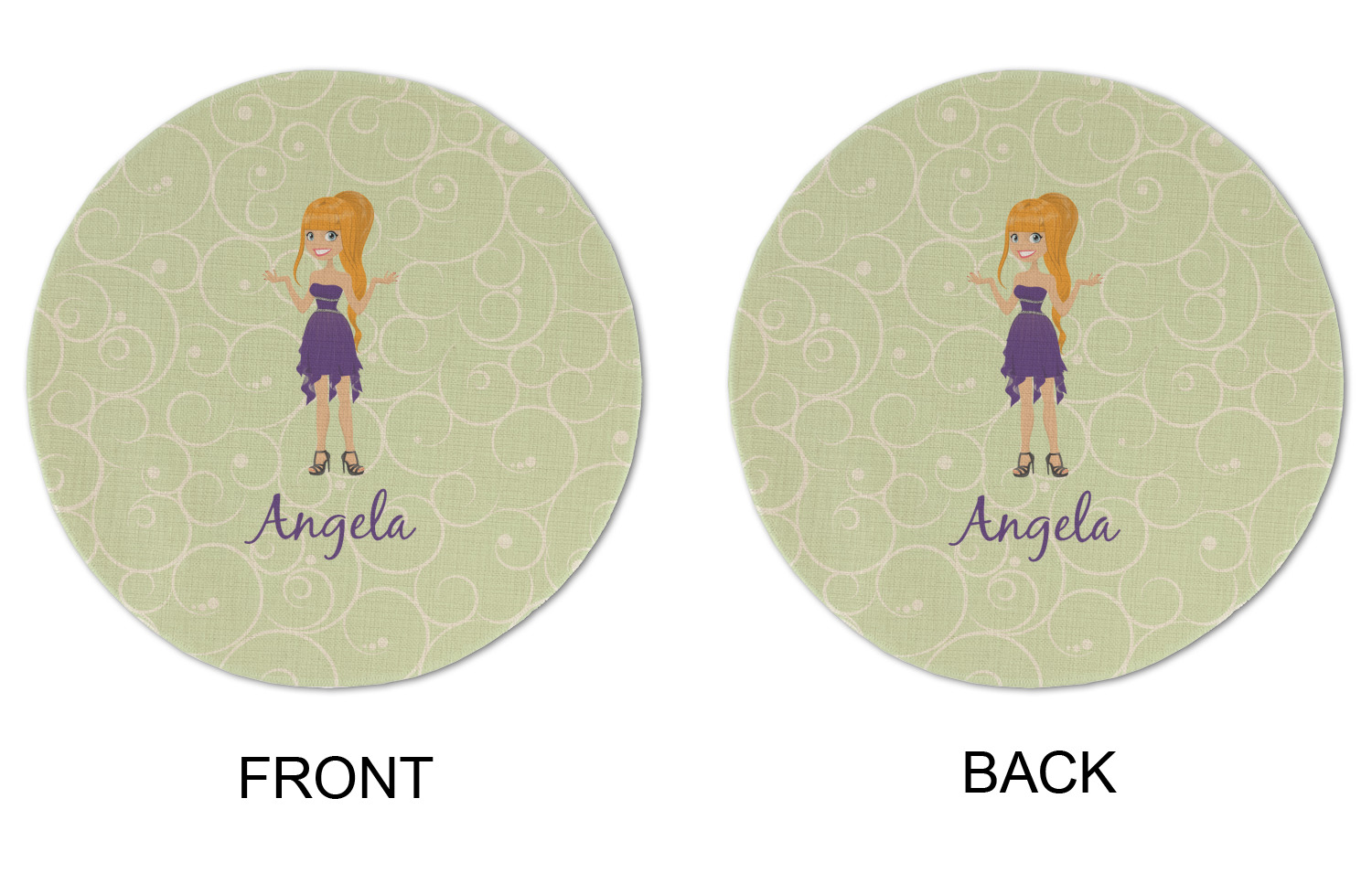 This design was built with a swirls background in a light green and cream color. We chose woman 1 wearing dress 3 and gave her blond hair, light skin, blue eyes, a purple dress and silver shoes. We personalized the design with her name.