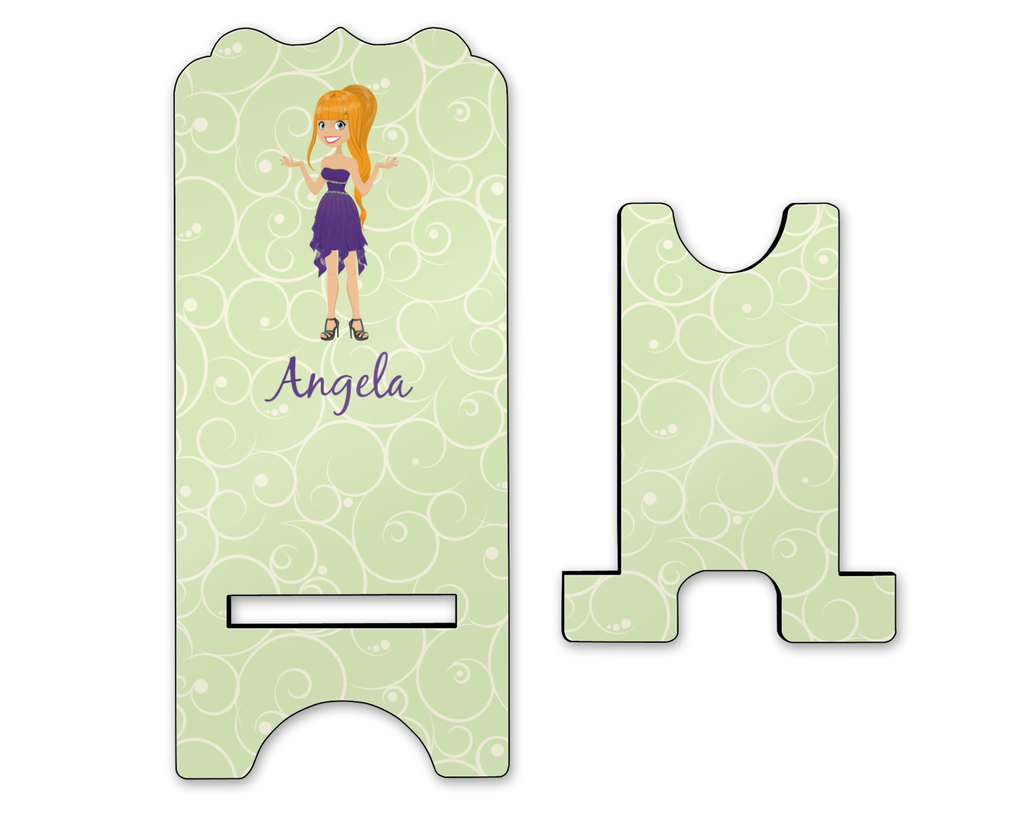 This design was built with a swirls background in a light green and cream color. We chose woman 1 wearing dress 3 and gave her blond hair, light skin, blue eyes, a purple dress and silver shoes. We personalized the design with her name.