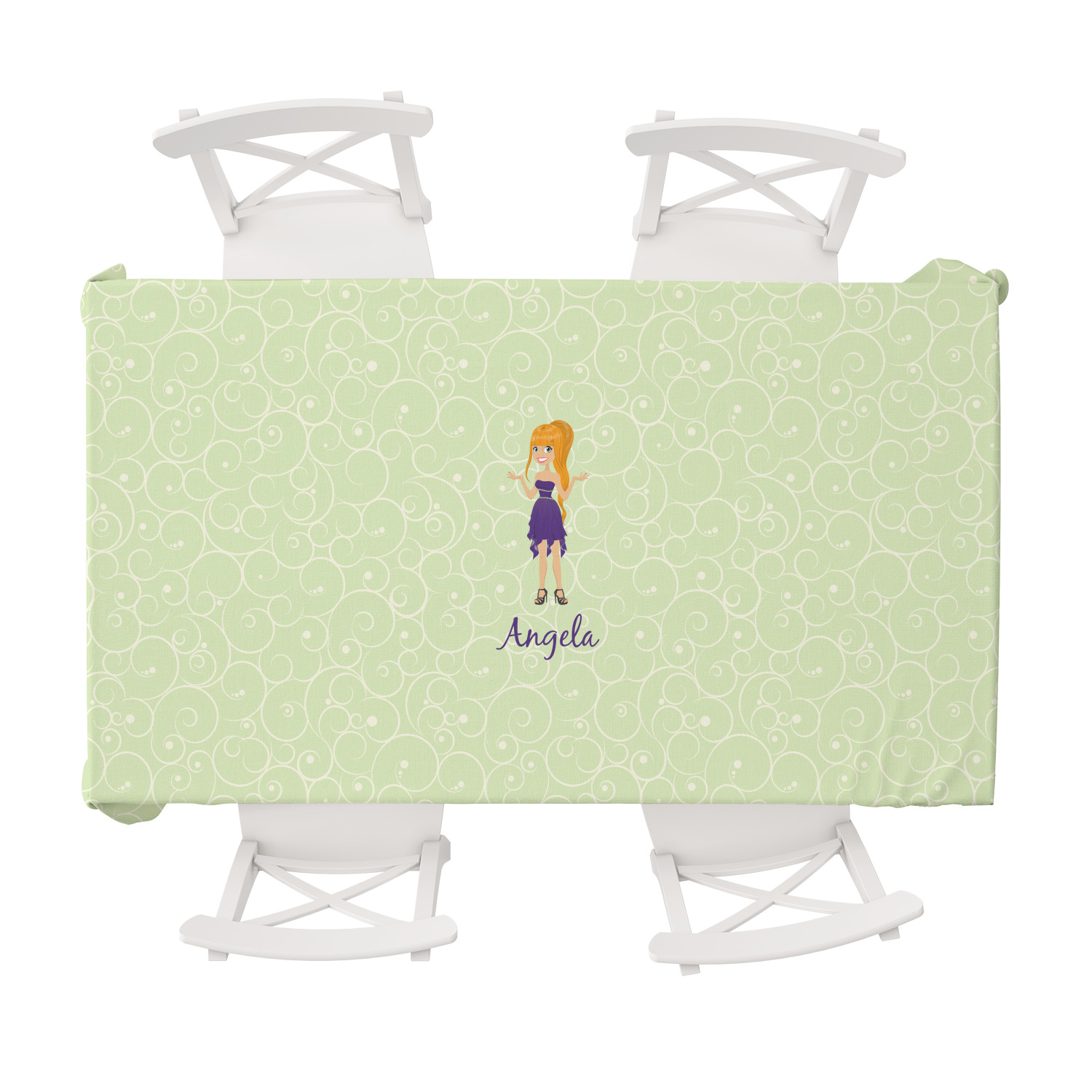 This design was built with a swirls background in a light green and cream color. We chose woman 1 wearing dress 3 and gave her blond hair, light skin, blue eyes, a purple dress and silver shoes. We personalized the design with her name.