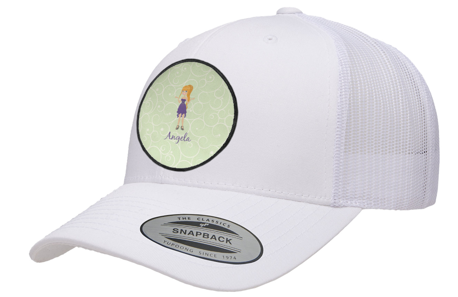 This design was built with a swirls background in a light green and cream color. We chose woman 1 wearing dress 3 and gave her blond hair, light skin, blue eyes, a purple dress and silver shoes. We personalized the design with her name.
