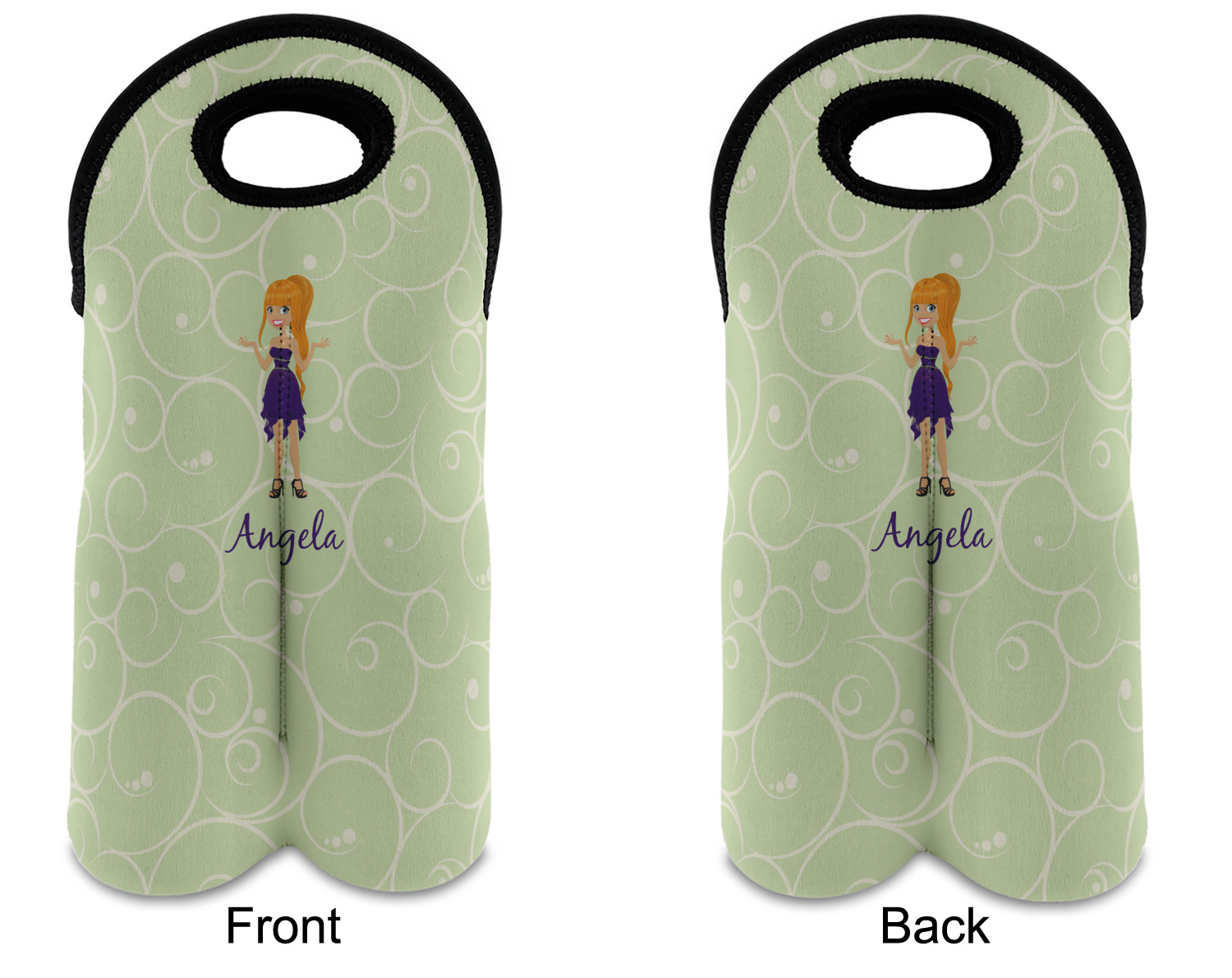 This design was built with a swirls background in a light green and cream color. We chose woman 1 wearing dress 3 and gave her blond hair, light skin, blue eyes, a purple dress and silver shoes. We personalized the design with her name.