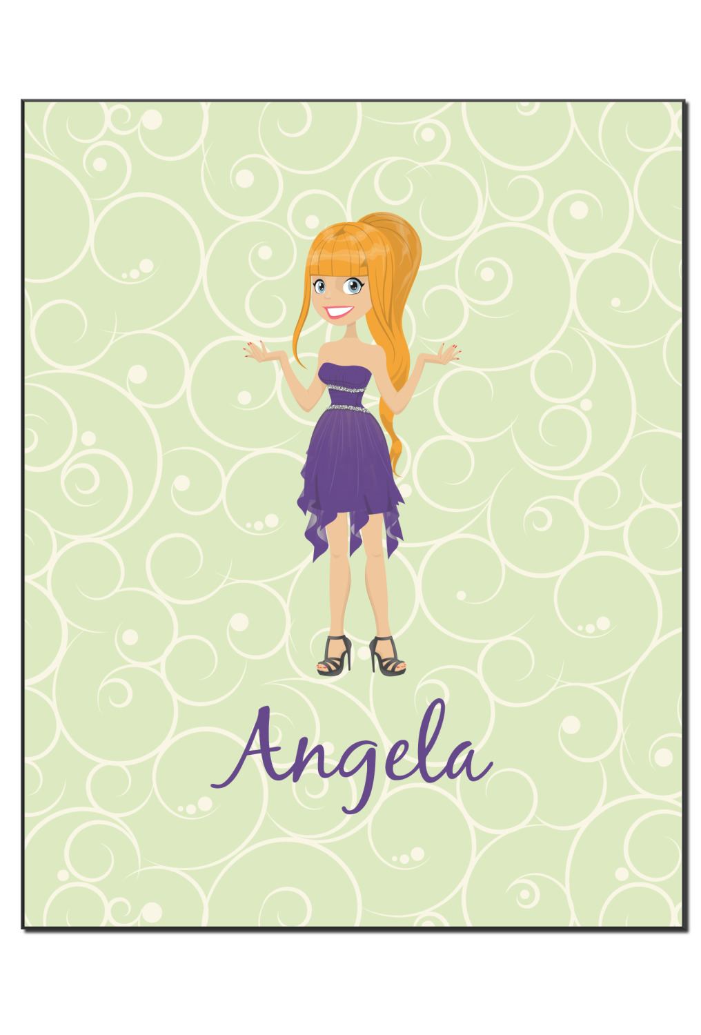 This design was built with a swirls background in a light green and cream color. We chose woman 1 wearing dress 3 and gave her blond hair, light skin, blue eyes, a purple dress and silver shoes. We personalized the design with her name.
