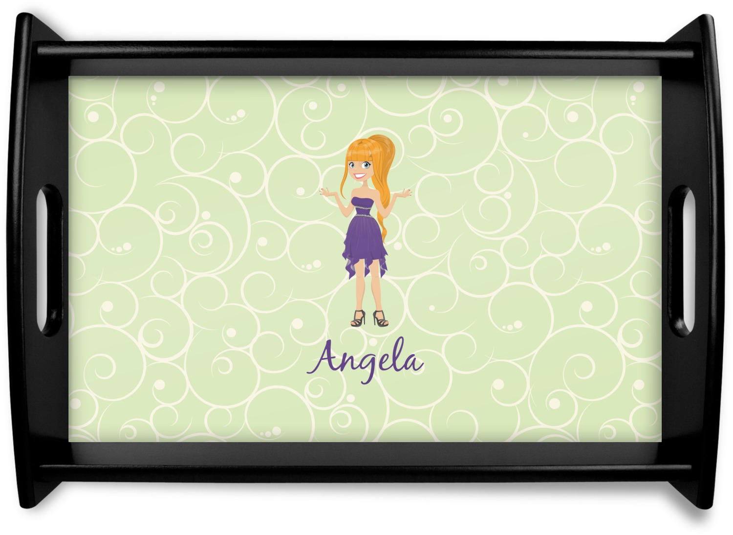 This serving tray with handles features square edges and two rounded sides, creating a very modern look. Each side is fabricated from a beautifully cut, natural wood. The bottom of the interior of the tray displays your customized design in bright, vibrant color. The tray is sold in both a black color and a natural wood look. Each variation of the wood serving tray has two sizes: Small, which is 14" x 10" x 2.25", and Large, which is 19.5" x 13.5" x 2.75".