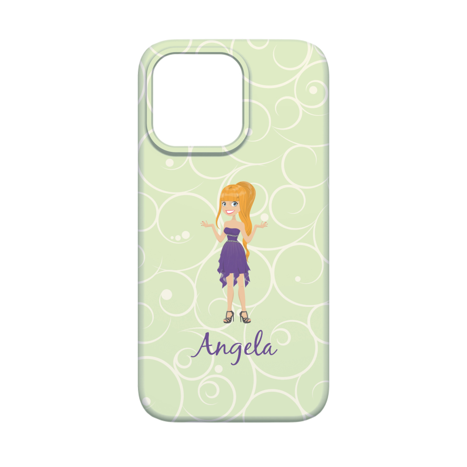This design was built with a swirls background in a light green and cream color. We chose woman 1 wearing dress 3 and gave her blond hair, light skin, blue eyes, a purple dress and silver shoes. We personalized the design with her name.
