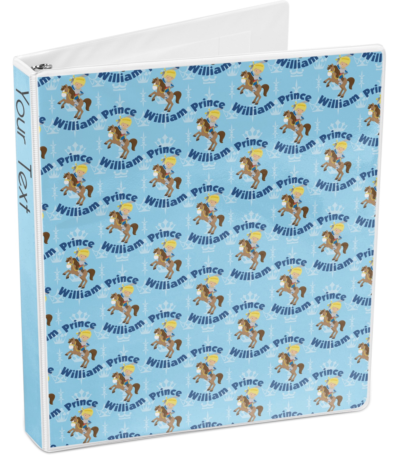 This is the perfect custom / personalized prince design for any young boy. We have created a layered pattern, where the first background is a simple tone on tone crowns pattern. We then layered it with our curved custom text and graphic, where we used "Prince" and "William" as the text and we used a graphic of a prince on horse.