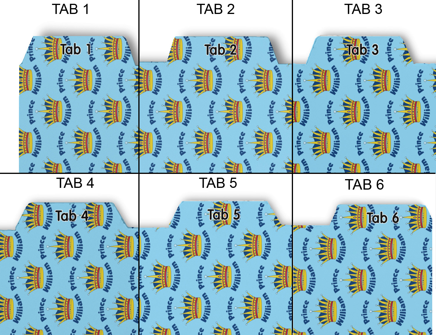 Whether you use binders at school or at work, we have designs to suit all of them. Available in 5 or 6 tab sets, you are sure to find a set to suit your needs. The back of each one is white and can be used to take notes, write vital information on, etc.