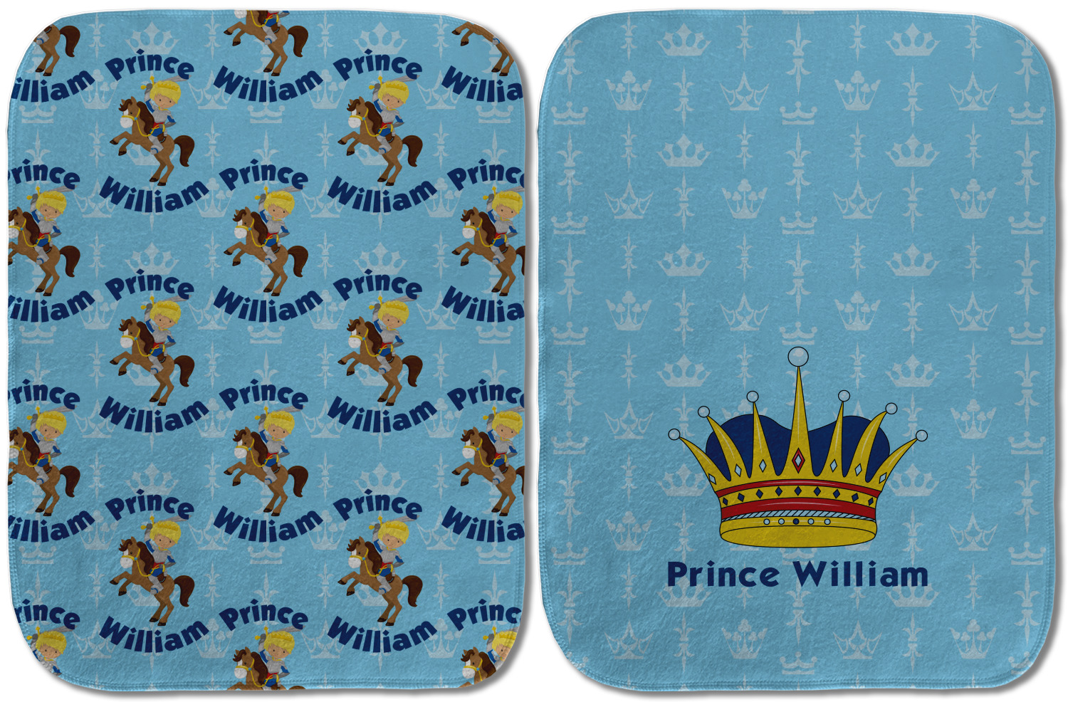 This is the perfect custom / personalized prince design for any young boy. We have created a layered pattern, where the first background is a simple tone on tone crowns pattern. We then layered it with our curved custom text and graphic, where we used "Prince" and "William" as the text and we used a graphic of a prince on horse.