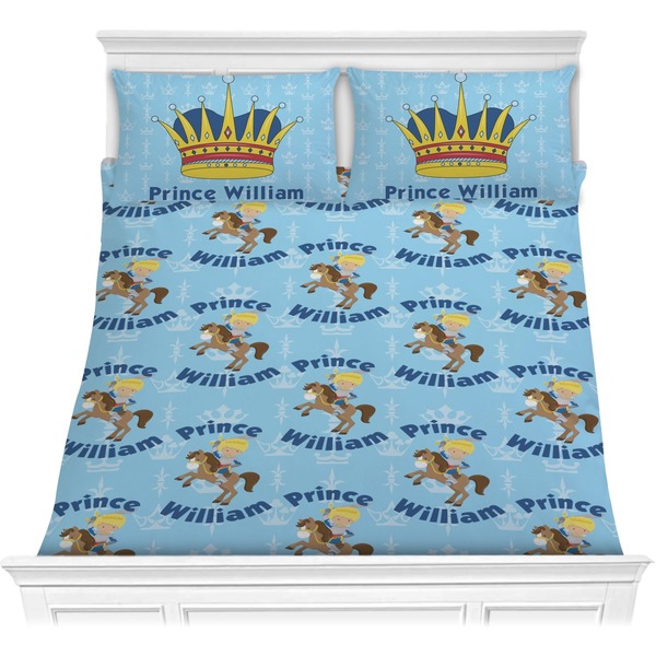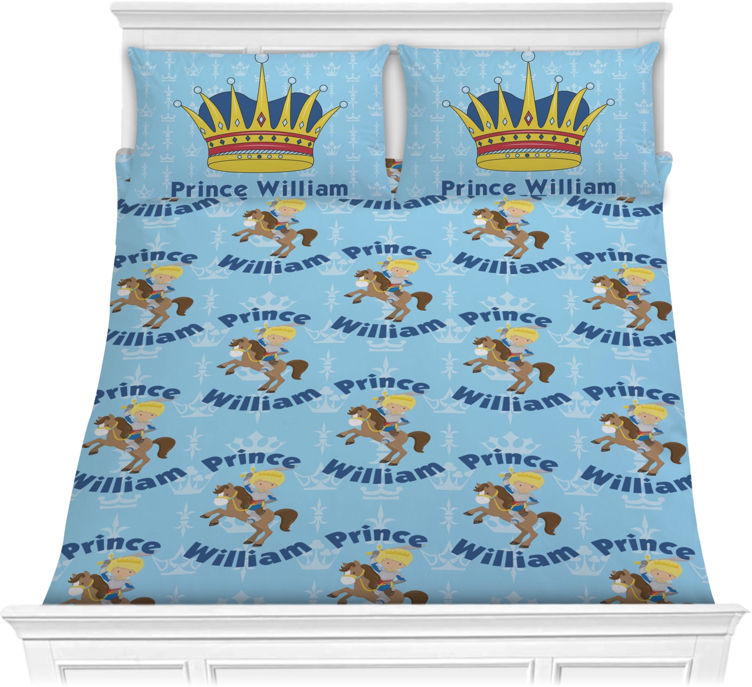 This is the perfect custom / personalized prince design for any young boy. We have created a layered pattern, where the first background is a simple tone on tone crowns pattern. We then layered it with our curved custom text and graphic, where we used "Prince" and "William" as the text and we used a graphic of a prince on horse.