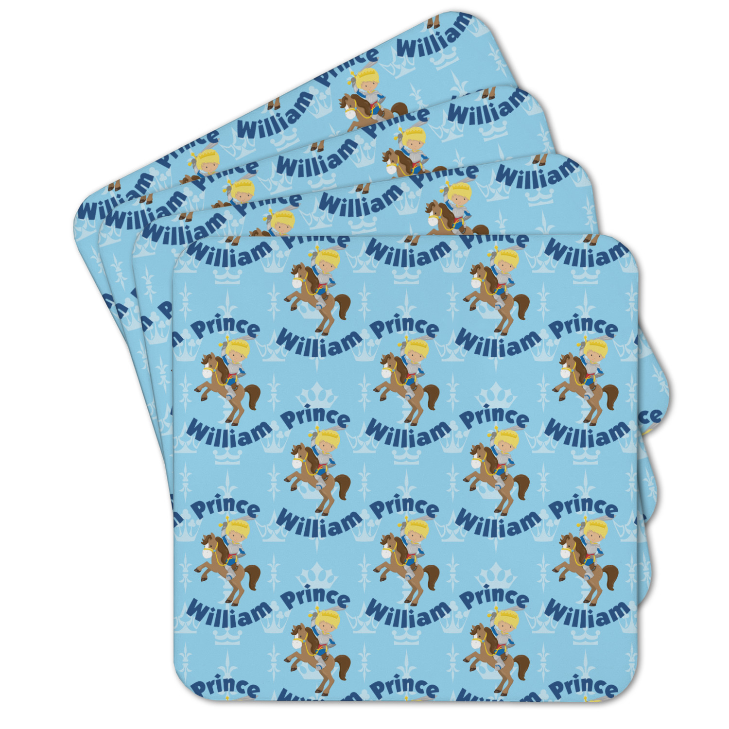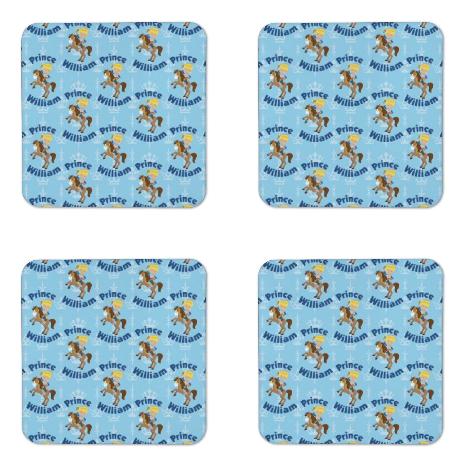 This is the perfect custom / personalized prince design for any young boy. We have created a layered pattern, where the first background is a simple tone on tone crowns pattern. We then layered it with our curved custom text and graphic, where we used "Prince" and "William" as the text and we used a graphic of a prince on horse.