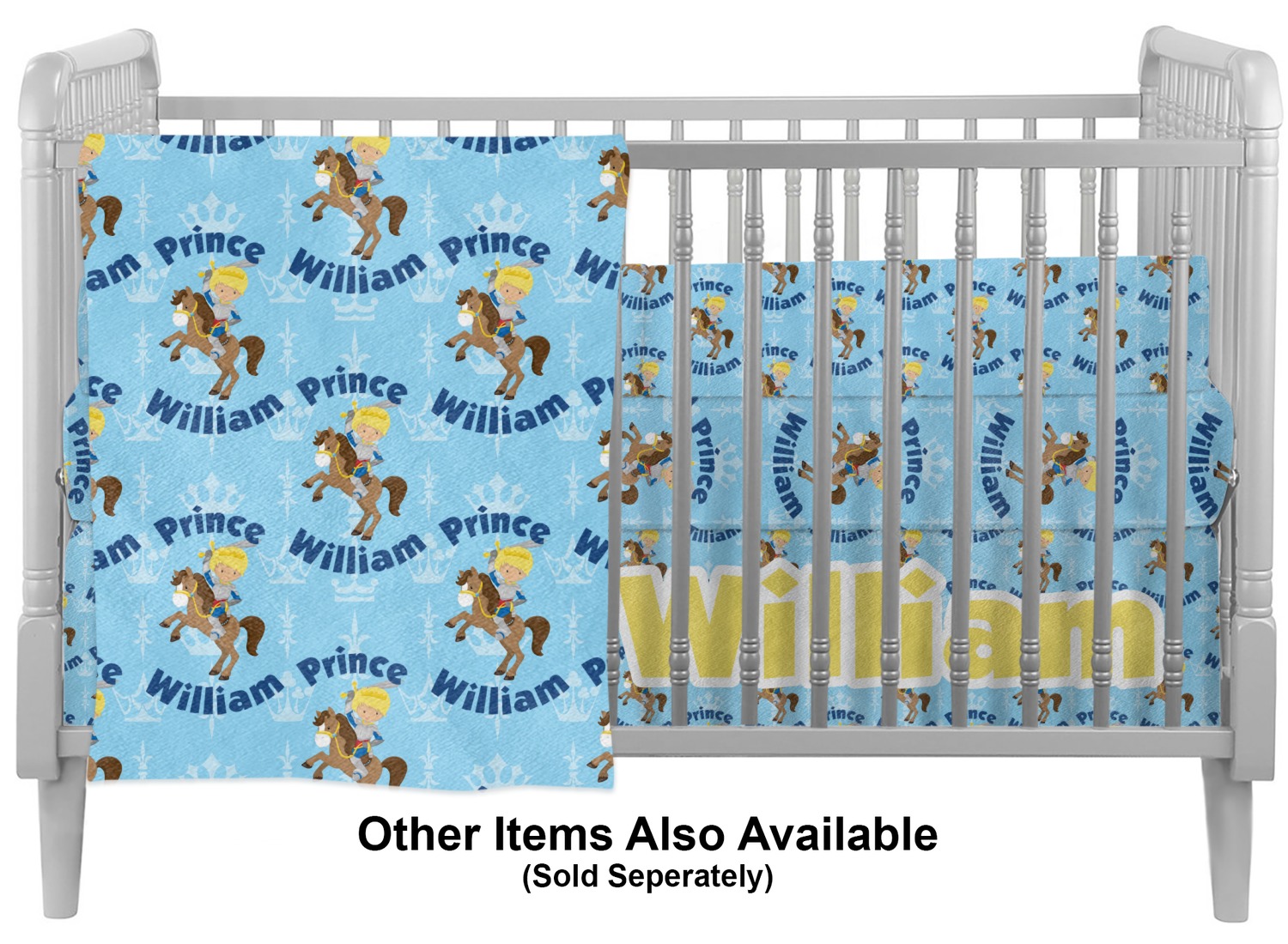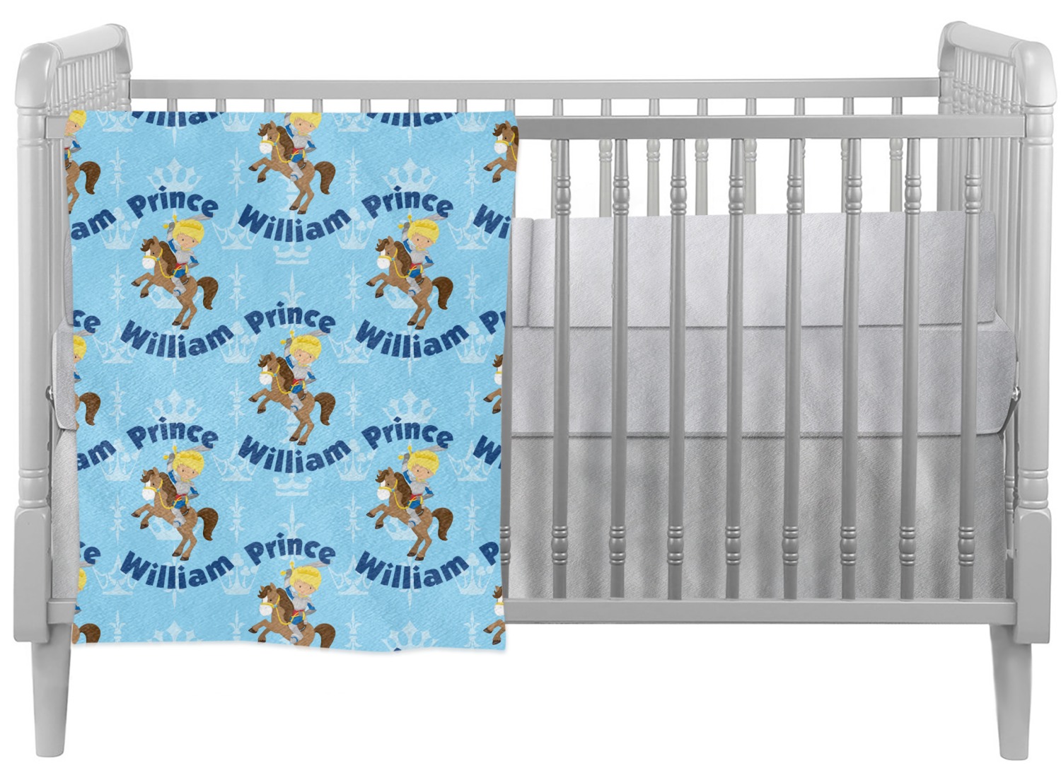 This is the perfect custom / personalized prince design for any young boy. We have created a layered pattern, where the first background is a simple tone on tone crowns pattern. We then layered it with our curved custom text and graphic, where we used "Prince" and "William" as the text and we used a graphic of a prince on horse.
