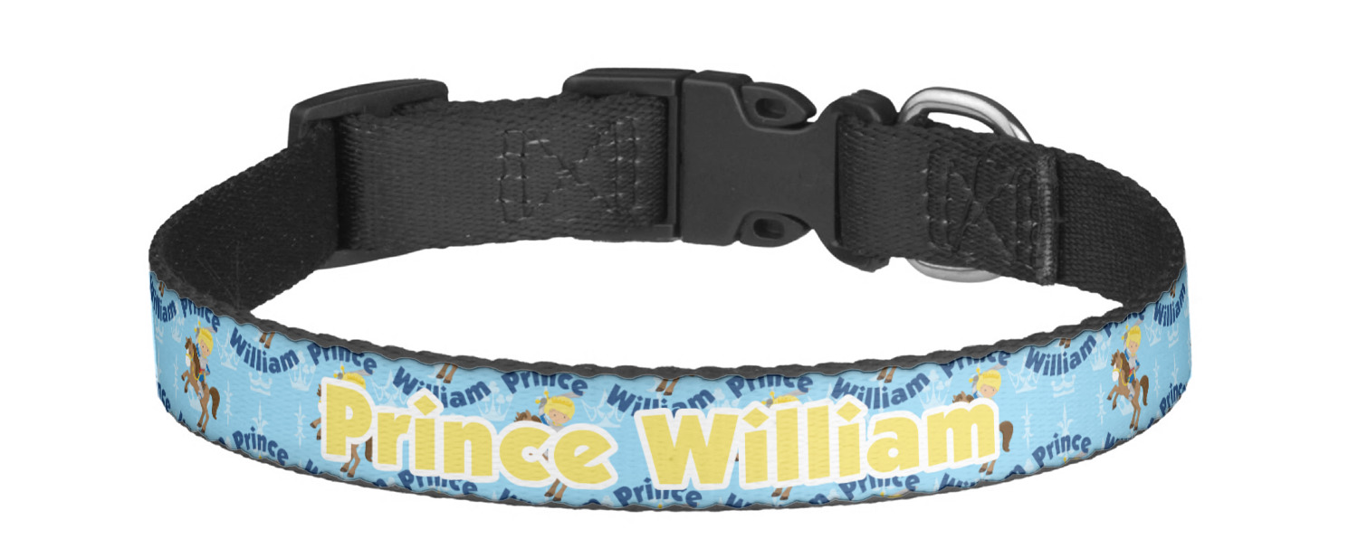 This sturdy collar, made from a durable nylon weave, will outlive your dog's episodes of excited tugging and pulling. Courtesy of its thick plastic buckle and adjuster, this collar is adjustable and accommodating of any dog. Structurally, the collar is a single piece of nylon weave that is sewn together, and features a solid metal loop where you can attach a leash or dog tag. We print and display your dog's name and pattern across the middle of the personalized dog collar.