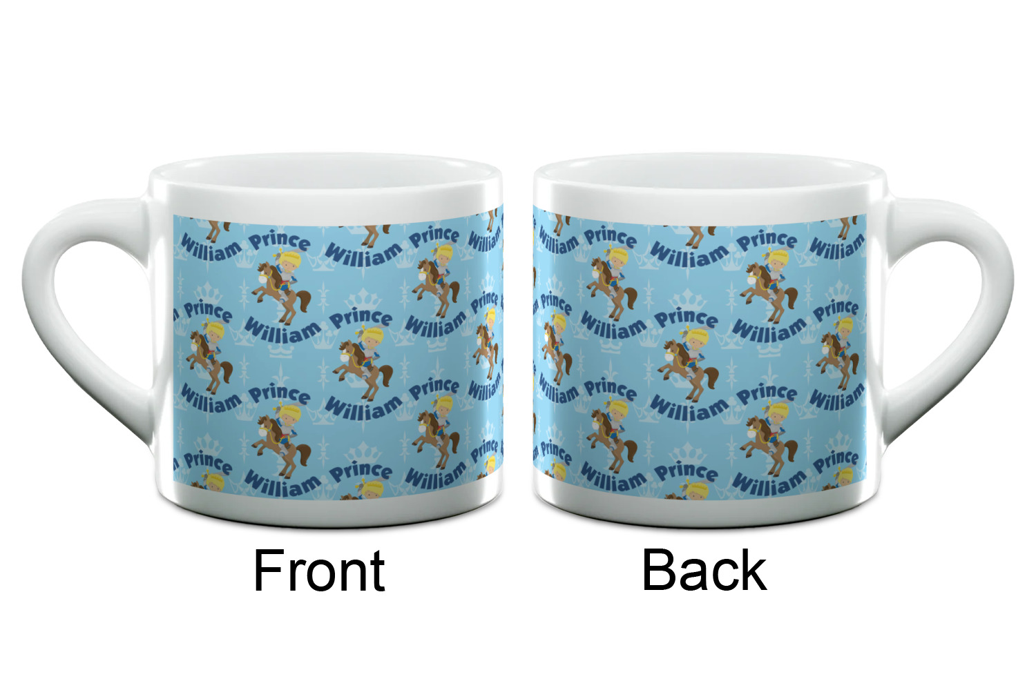 This is the perfect custom / personalized prince design for any young boy. We have created a layered pattern, where the first background is a simple tone on tone crowns pattern. We then layered it with our curved custom text and graphic, where we used "Prince" and "William" as the text and we used a graphic of a prince on horse.
