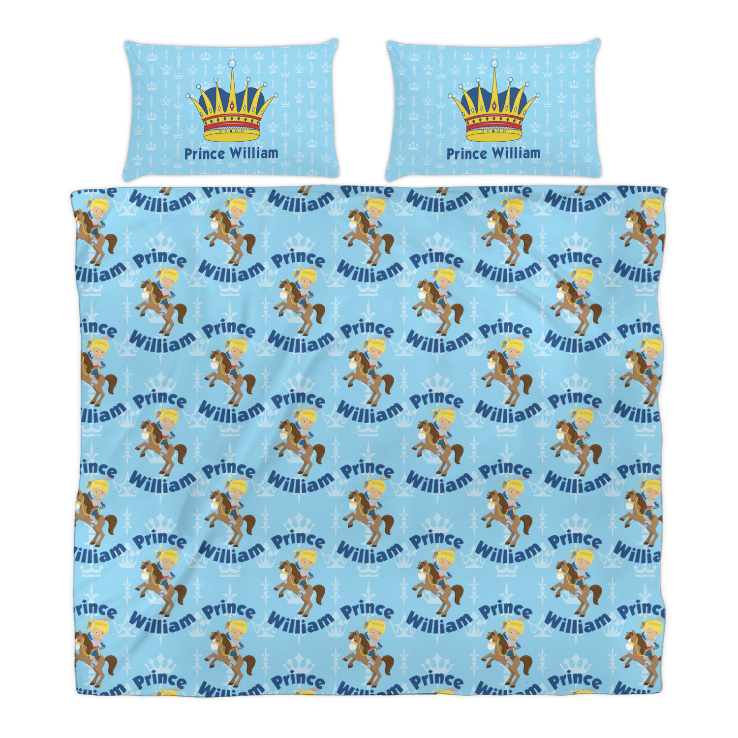 This is the perfect custom / personalized prince design for any young boy. We have created a layered pattern, where the first background is a simple tone on tone crowns pattern. We then layered it with our curved custom text and graphic, where we used "Prince" and "William" as the text and we used a graphic of a prince on horse.