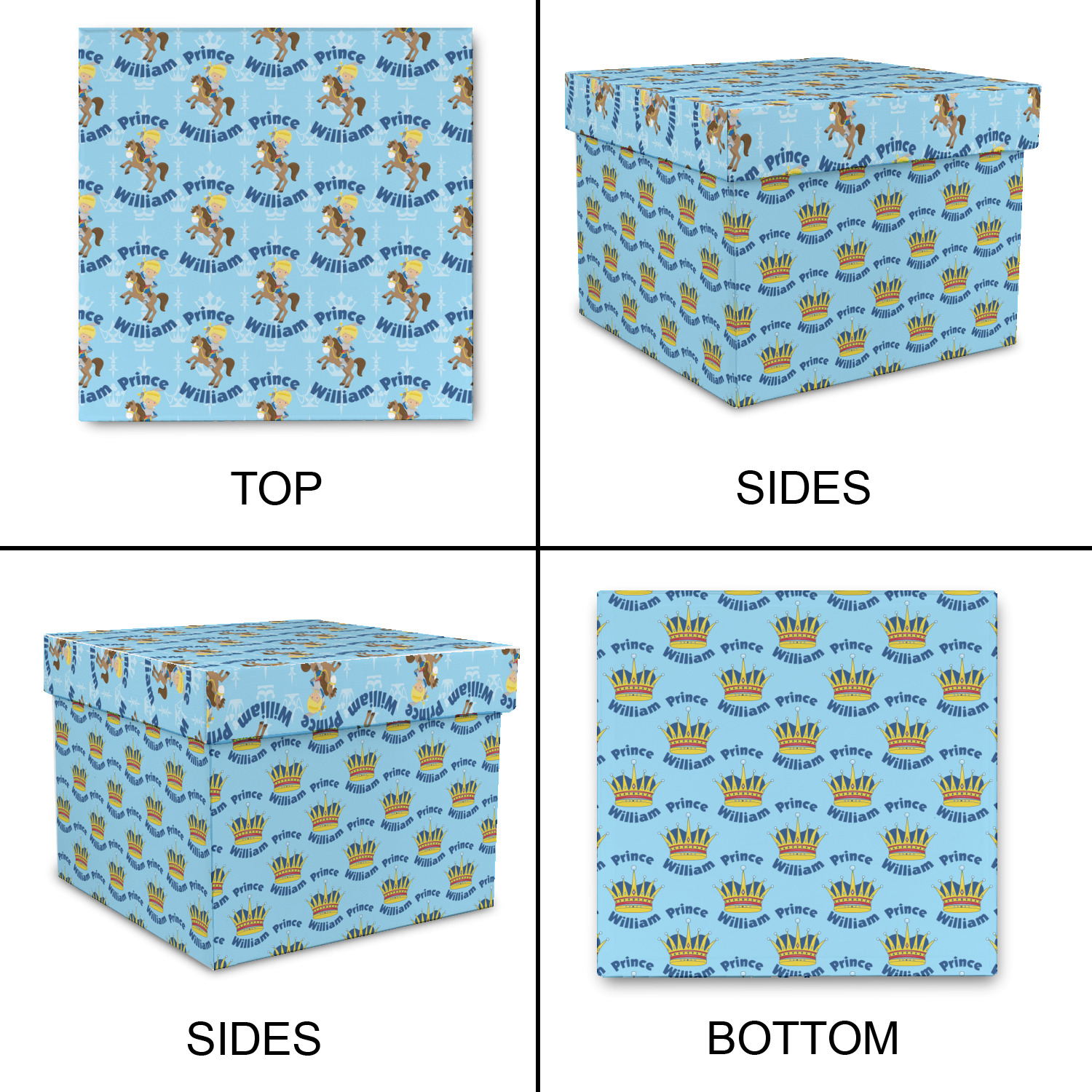 This is the perfect custom / personalized prince design for any young boy. We have created a layered pattern, where the first background is a simple tone on tone crowns pattern. We then layered it with our curved custom text and graphic, where we used "Prince" and "William" as the text and we used a graphic of a prince on horse.