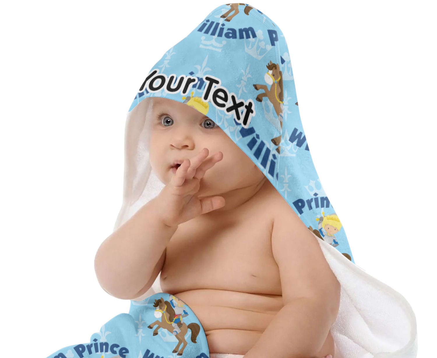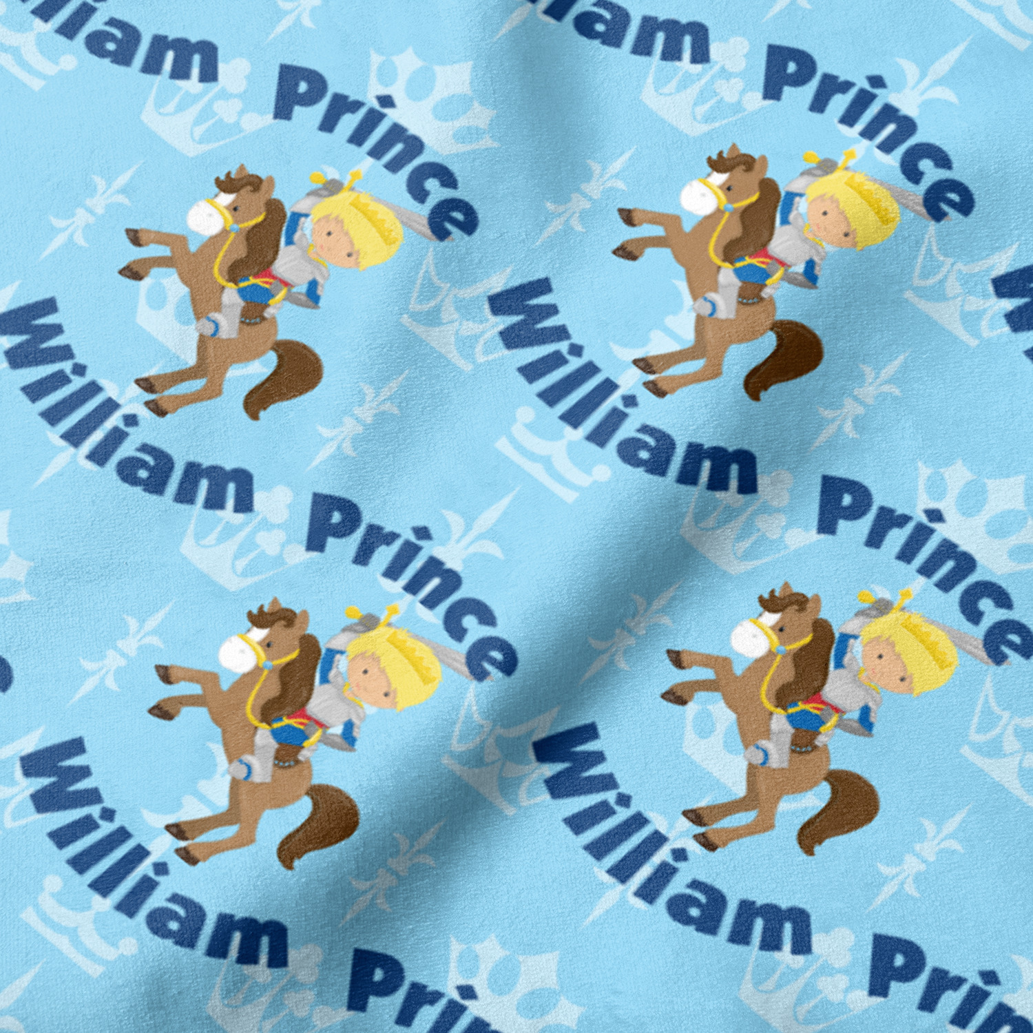 This is the perfect custom / personalized prince design for any young boy. We have created a layered pattern, where the first background is a simple tone on tone crowns pattern. We then layered it with our curved custom text and graphic, where we used "Prince" and "William" as the text and we used a graphic of a prince on horse.