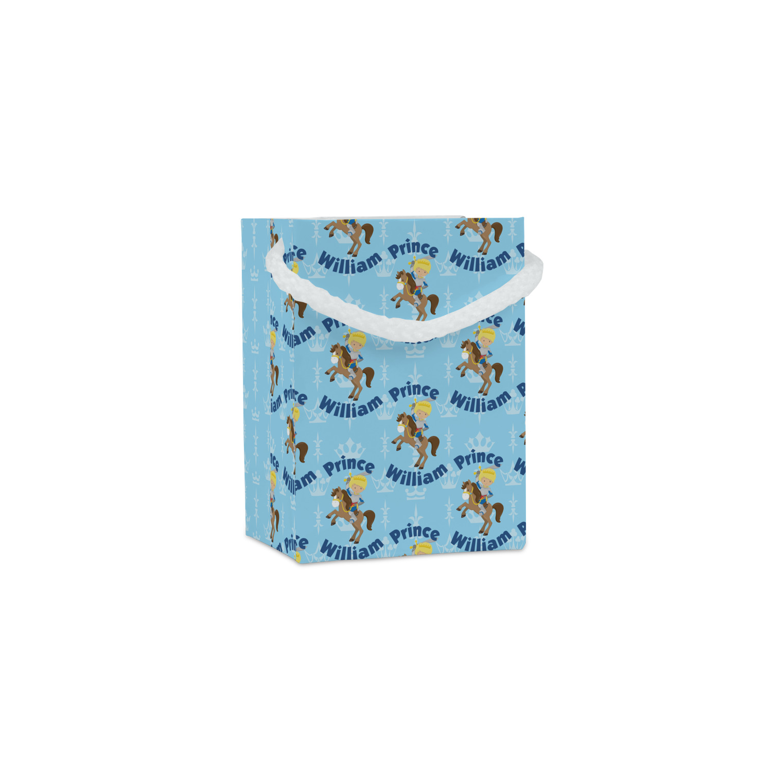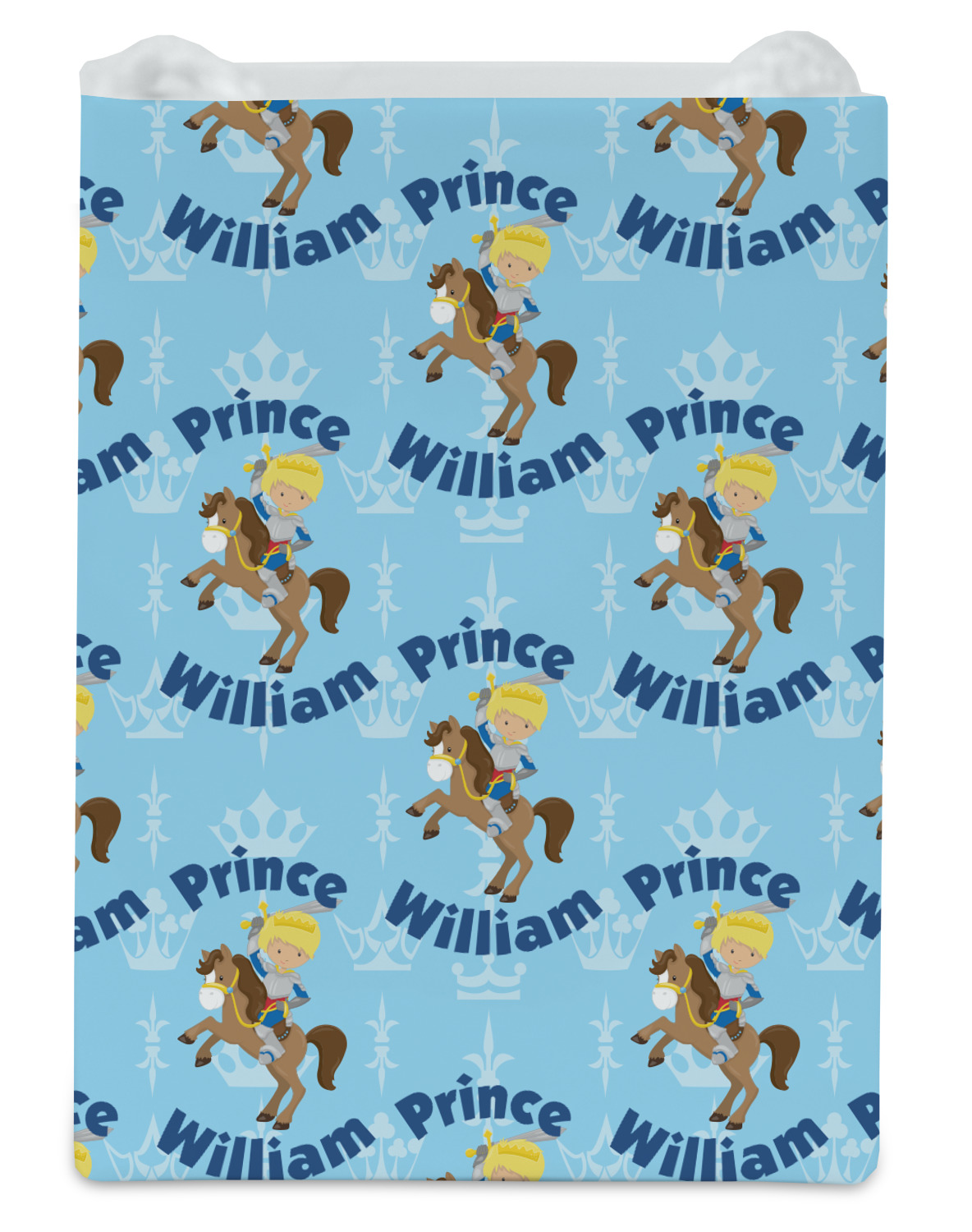 This is the perfect custom / personalized prince design for any young boy. We have created a layered pattern, where the first background is a simple tone on tone crowns pattern. We then layered it with our curved custom text and graphic, where we used "Prince" and "William" as the text and we used a graphic of a prince on horse.