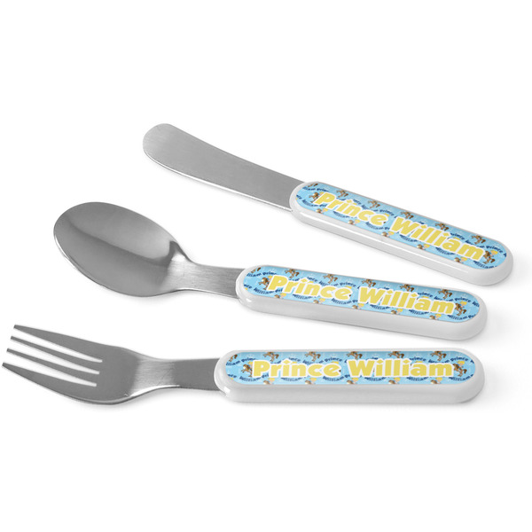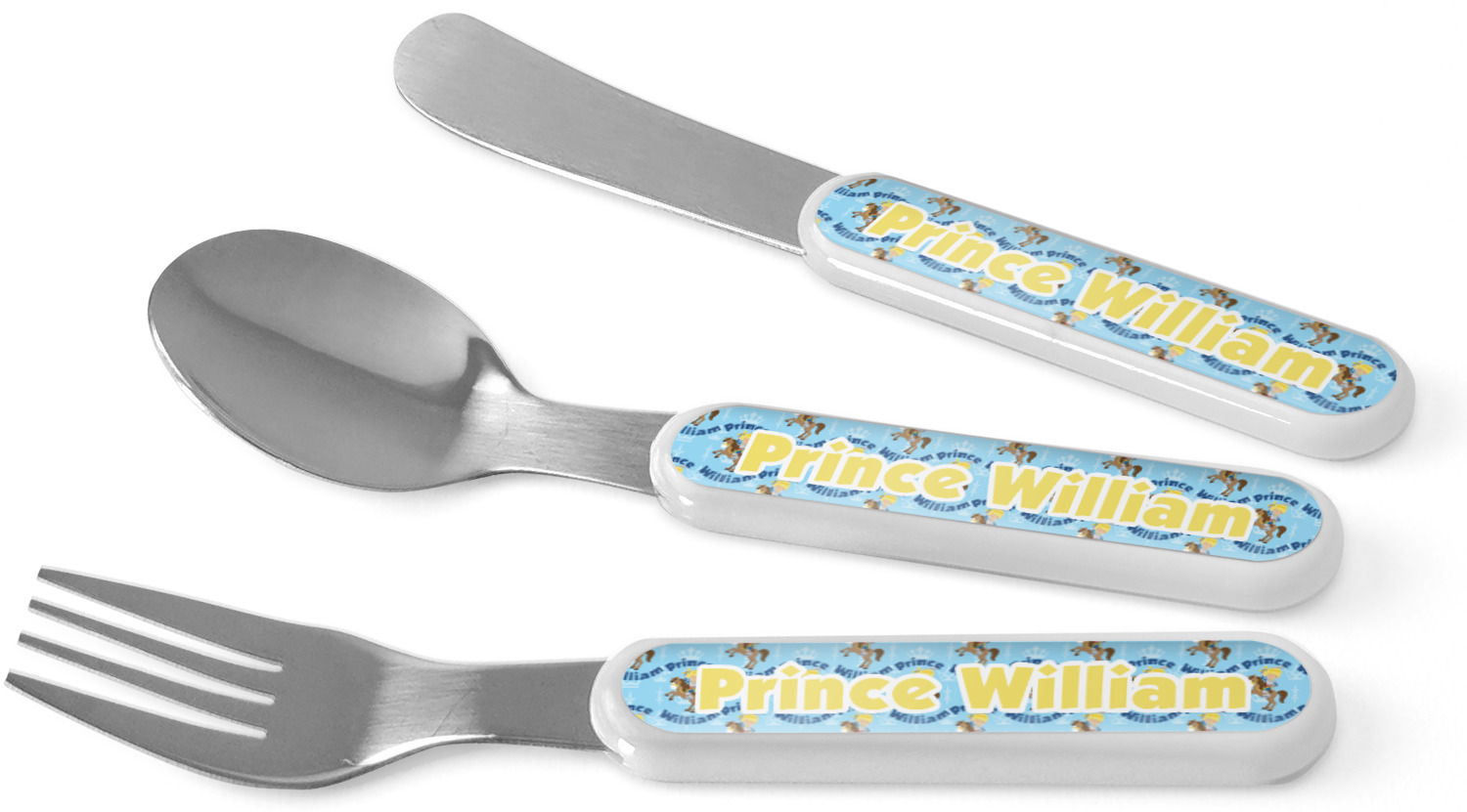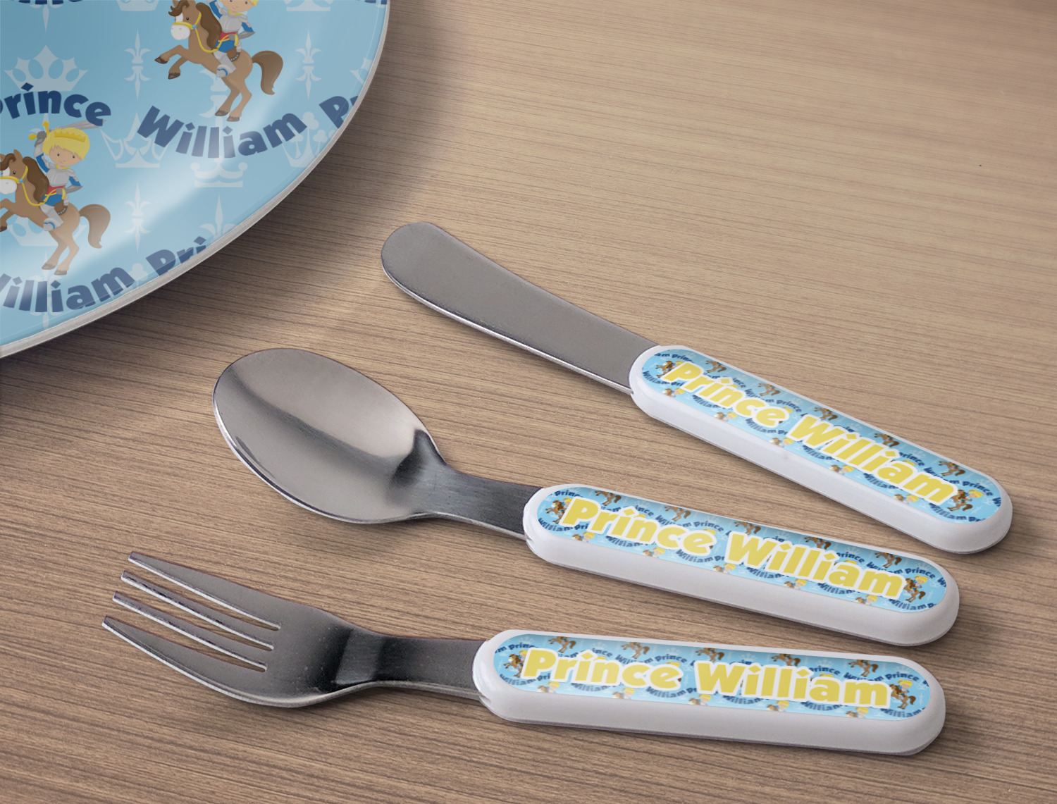 This set of kids' silverware includes a 5.5 inch spoon, fork, and knife, catered to your little one's needs. The prongs of this fork are flat and dull, while our spoon is small enough for tiny mouths, and the dullness of the knife itself resembles a butter knife, at most. These kids' utensils are made of stainless steel, while the handles are crafted from a durable plastic that will withstand the energy and use of your young one. We print your customization across the handles, making the cutlery set unique to your child only.