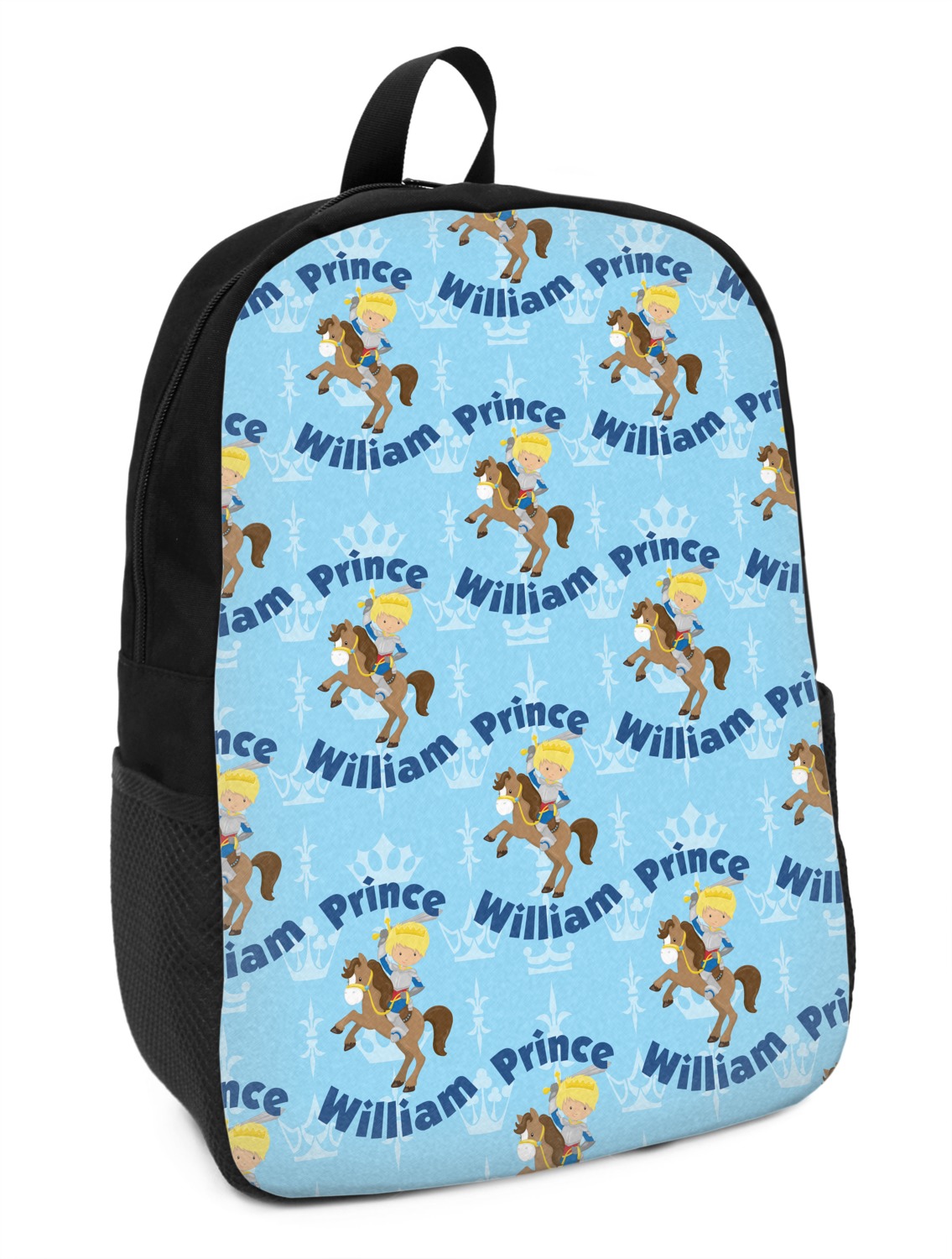 This is the perfect custom / personalized prince design for any young boy. We have created a layered pattern, where the first background is a simple tone on tone crowns pattern. We then layered it with our curved custom text and graphic, where we used "Prince" and "William" as the text and we used a graphic of a prince on horse.