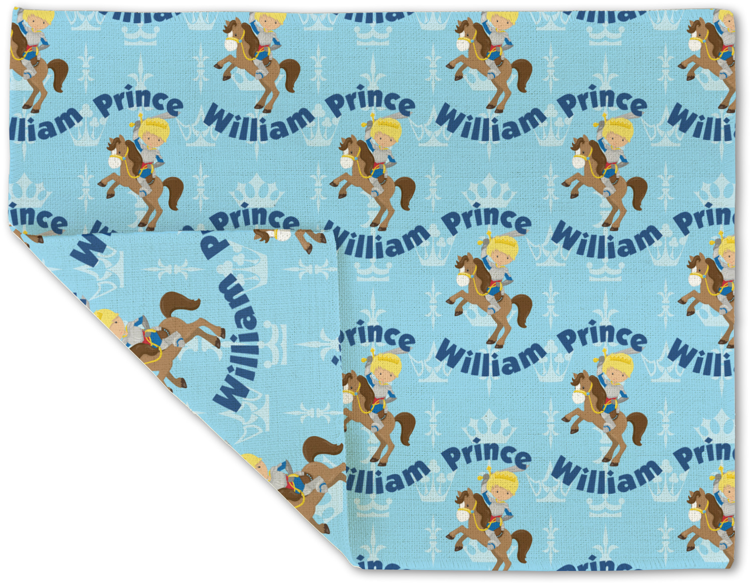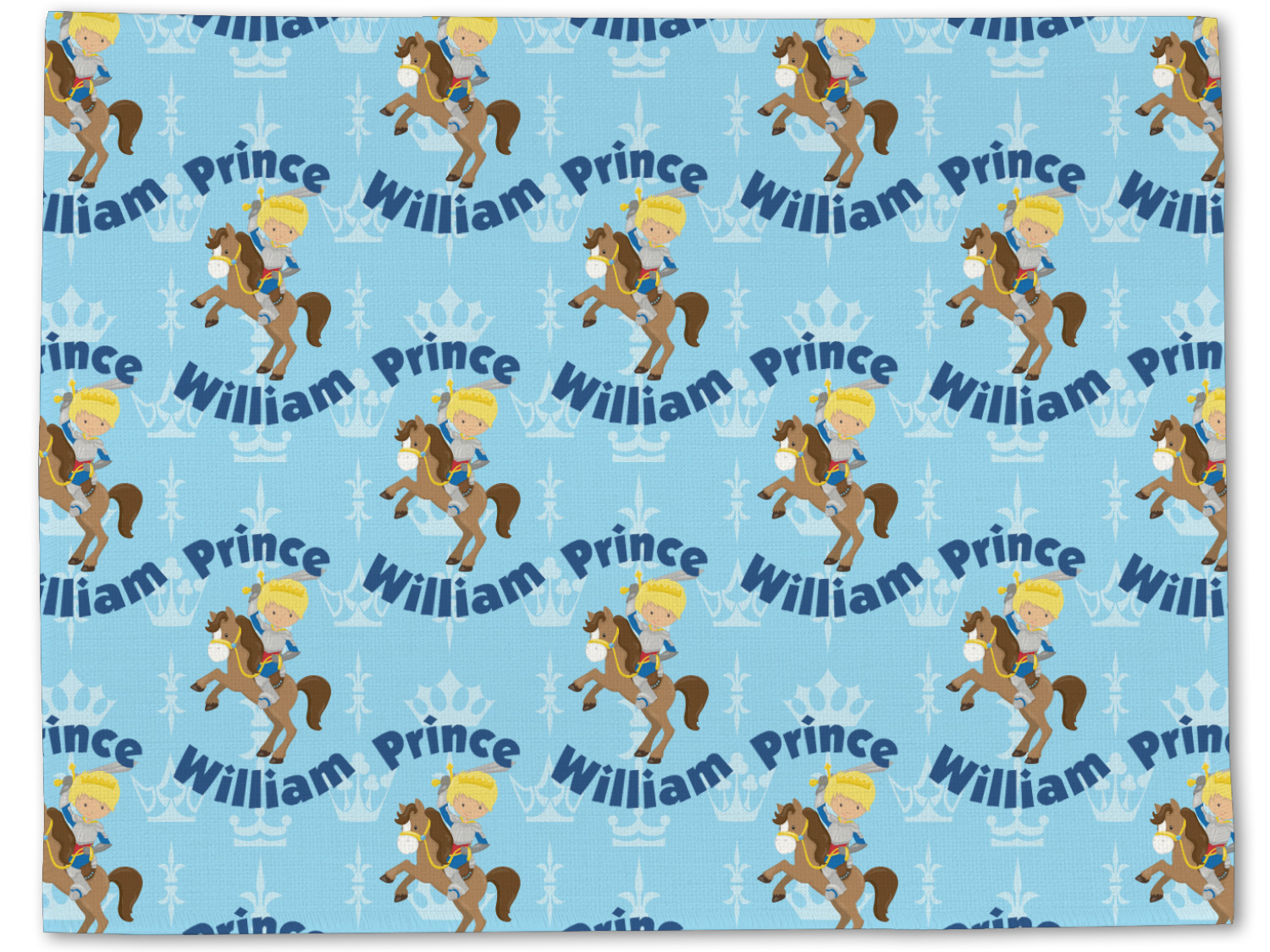 This is the perfect custom / personalized prince design for any young boy. We have created a layered pattern, where the first background is a simple tone on tone crowns pattern. We then layered it with our curved custom text and graphic, where we used "Prince" and "William" as the text and we used a graphic of a prince on horse.