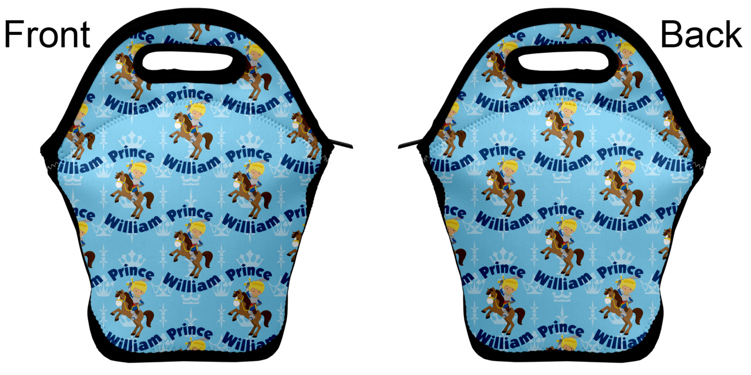 Our personalized lunch bags are made from a strong neoprene, and secure with a zipper closure that lines the top of the bag.The edges of the neoprene are sewn together with a heavy duty stitch, adding to the durability of the bag. The is accompanied by a reinforced handle at its top, for the easy transport of your lunch. We display your personalization across both the front and back of this neoprene lunch bag, while the remaining sides are a sleek black in color. Each bag measures at 13.5 inches tall, and 11.5 inches wide.