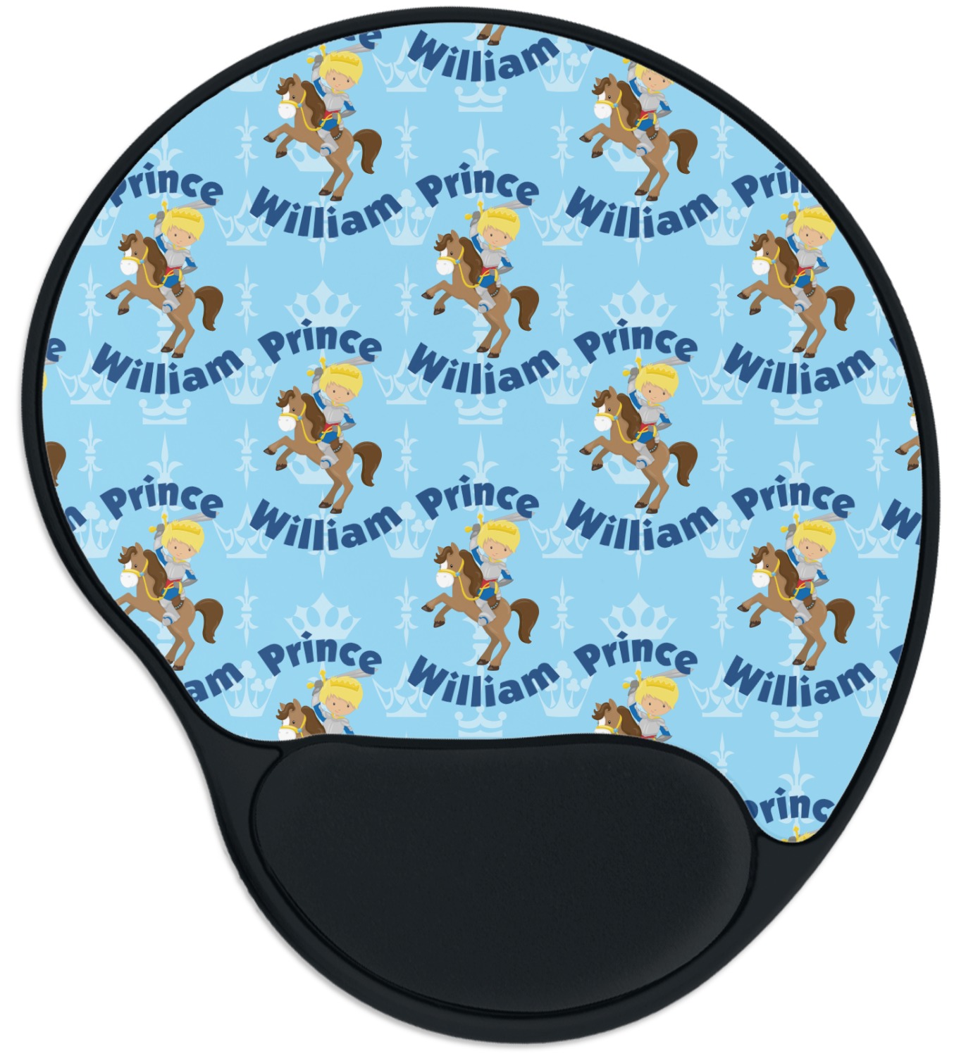 This is the perfect custom / personalized prince design for any young boy. We have created a layered pattern, where the first background is a simple tone on tone crowns pattern. We then layered it with our curved custom text and graphic, where we used "Prince" and "William" as the text and we used a graphic of a prince on horse.