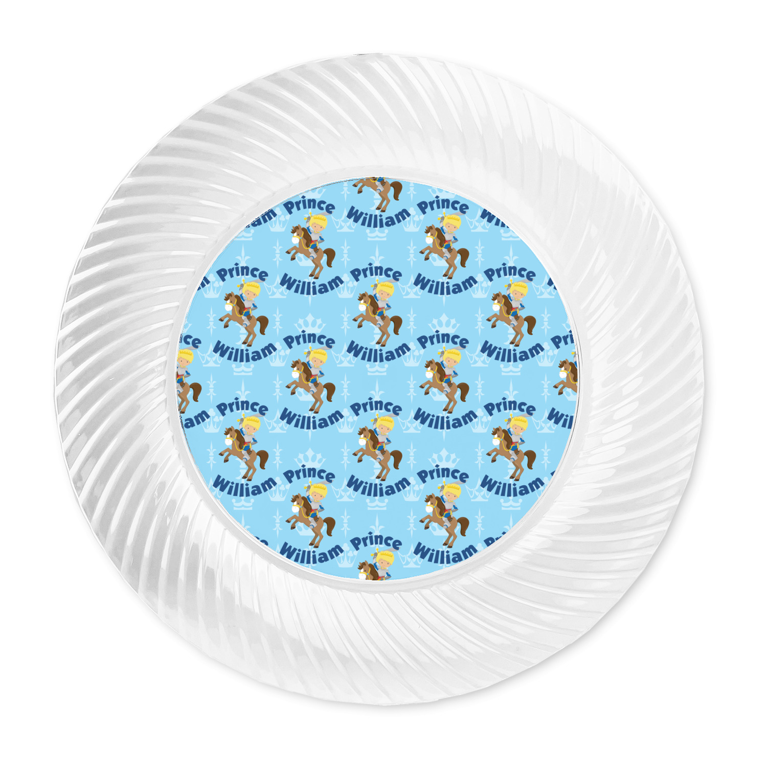 This is the perfect custom / personalized prince design for any young boy. We have created a layered pattern, where the first background is a simple tone on tone crowns pattern. We then layered it with our curved custom text and graphic, where we used "Prince" and "William" as the text and we used a graphic of a prince on horse.