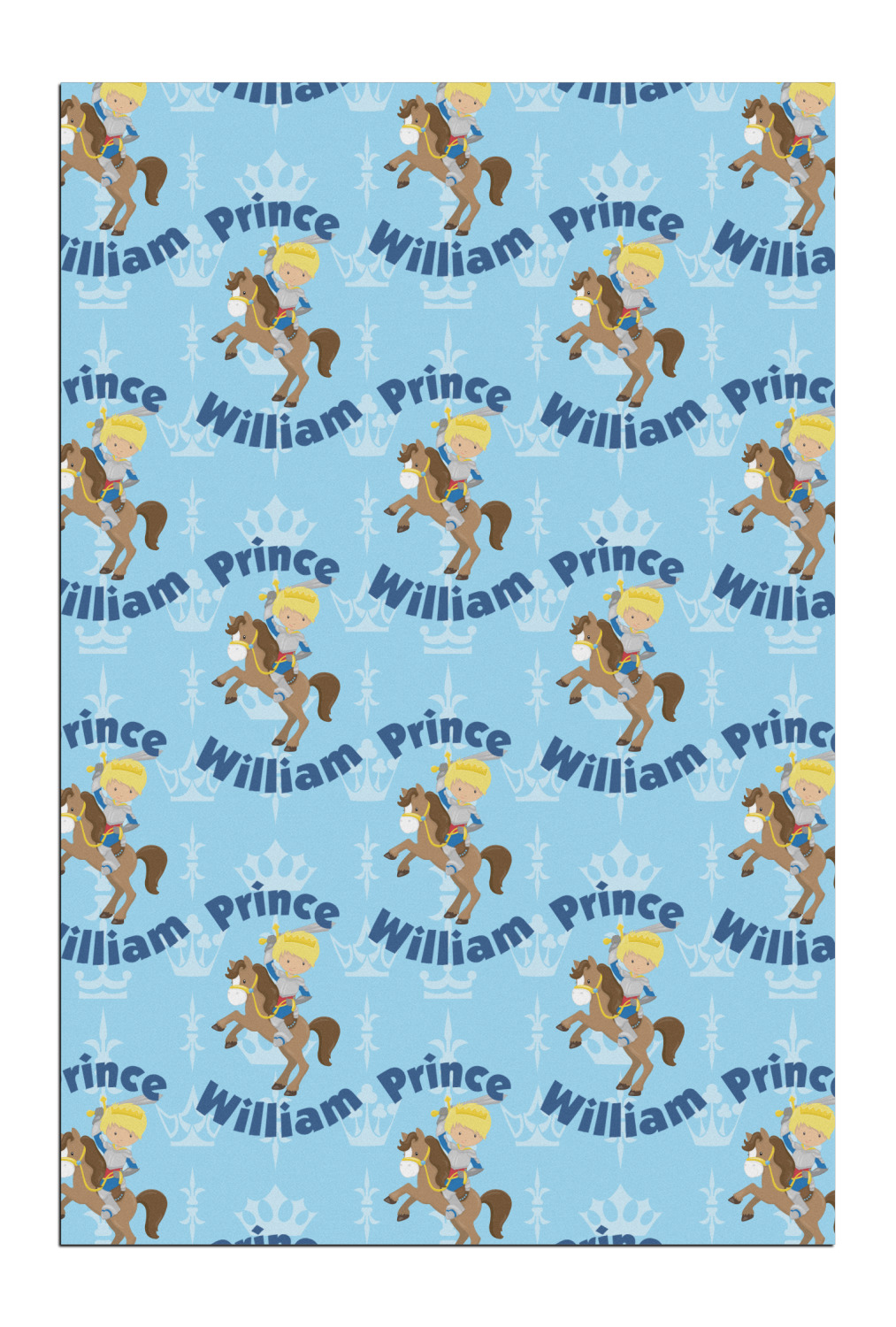 This is the perfect custom / personalized prince design for any young boy. We have created a layered pattern, where the first background is a simple tone on tone crowns pattern. We then layered it with our curved custom text and graphic, where we used "Prince" and "William" as the text and we used a graphic of a prince on horse.
