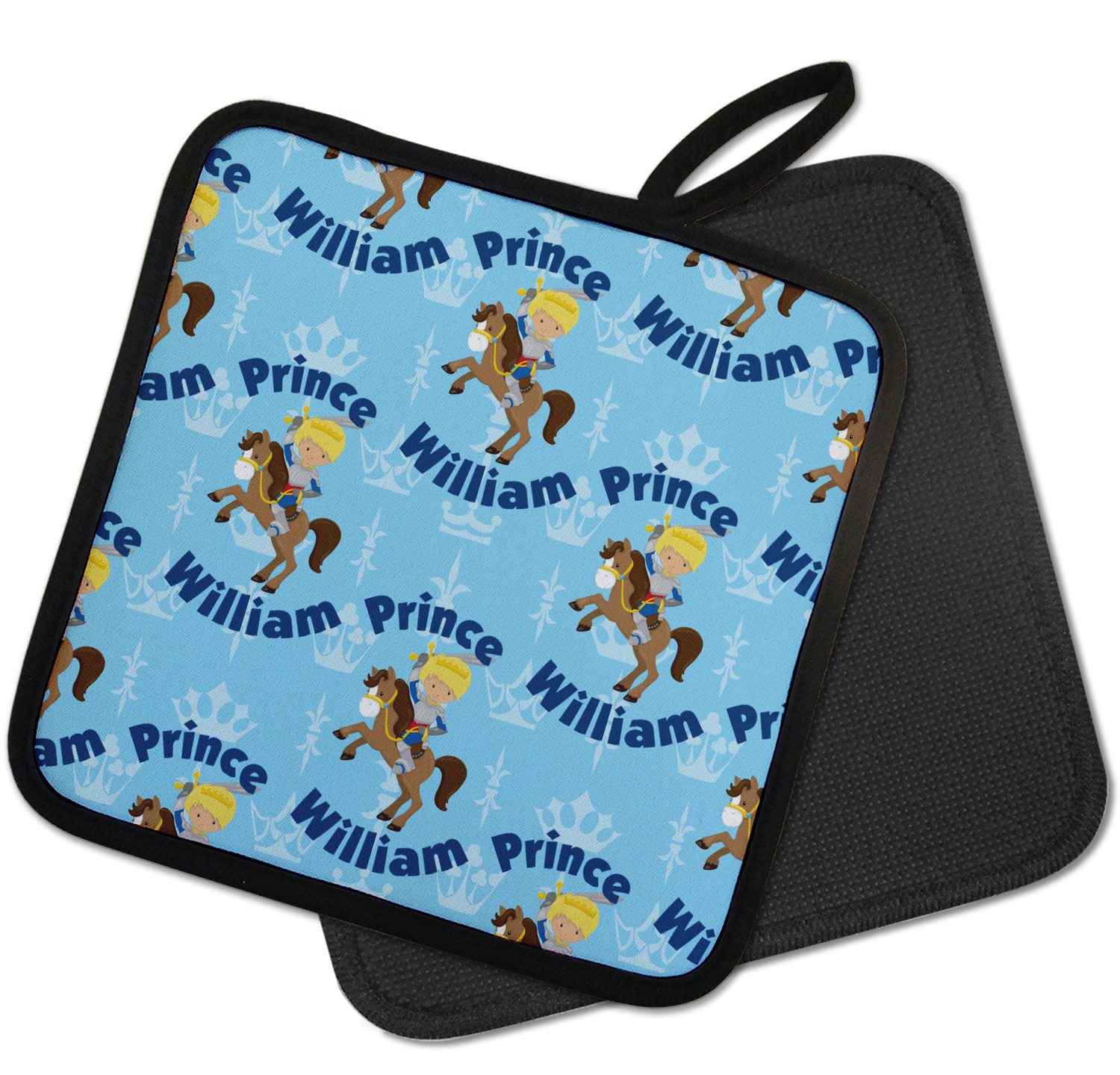 Our personalized pot holders feature a neoprene front that displays your personalization in vibrant colors. The backing of the hot pot holder is rubberized; the textured backing allows you to have a great grip when using this custom pot holder. The two materials are joined with a sleek, black trim, and the holder also includes an attached loop for hanging and storage. The pot holder is approximately 8.75 inches by 8.75 inches and 0.25 inches tall, while the fabric loop is 2.5 inches long. You can purchase a kitchen pot holder by itself or as a set of 2. We also offer a set including one pot holder and one oven mitt.