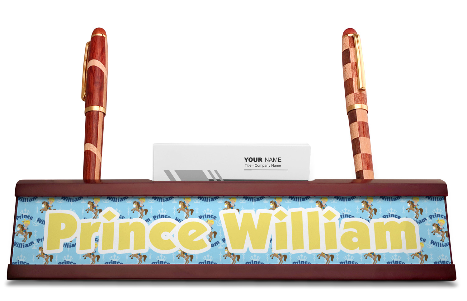 Your desk name plates are crafted from a high-quality, dark-cherry mahogany. At approximately 9.5 by 1.875 by 2.5 inches, this name plaque will fit perfectly, front and center, on your desk. Your customization spans across the entire face of the nameplate. Behind the nameplate lies a skinny slot that can fit approximately 15, traditionally-sized, business cards. You can also store your writing utensils on either side of this custom desk name plate.