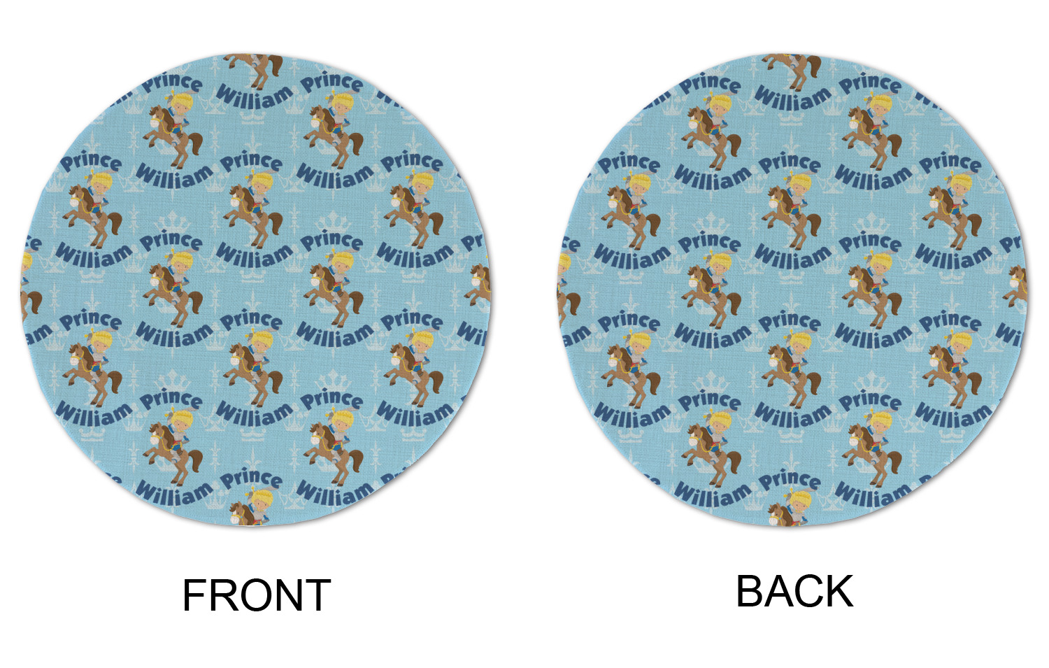 This is the perfect custom / personalized prince design for any young boy. We have created a layered pattern, where the first background is a simple tone on tone crowns pattern. We then layered it with our curved custom text and graphic, where we used "Prince" and "William" as the text and we used a graphic of a prince on horse.