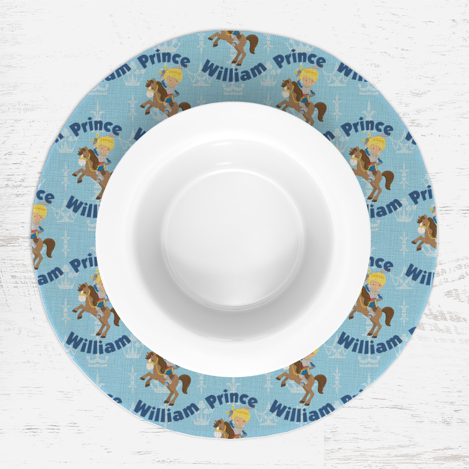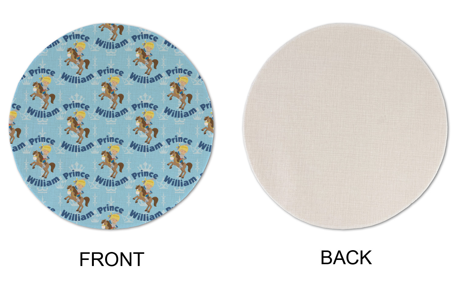 This is the perfect custom / personalized prince design for any young boy. We have created a layered pattern, where the first background is a simple tone on tone crowns pattern. We then layered it with our curved custom text and graphic, where we used "Prince" and "William" as the text and we used a graphic of a prince on horse.